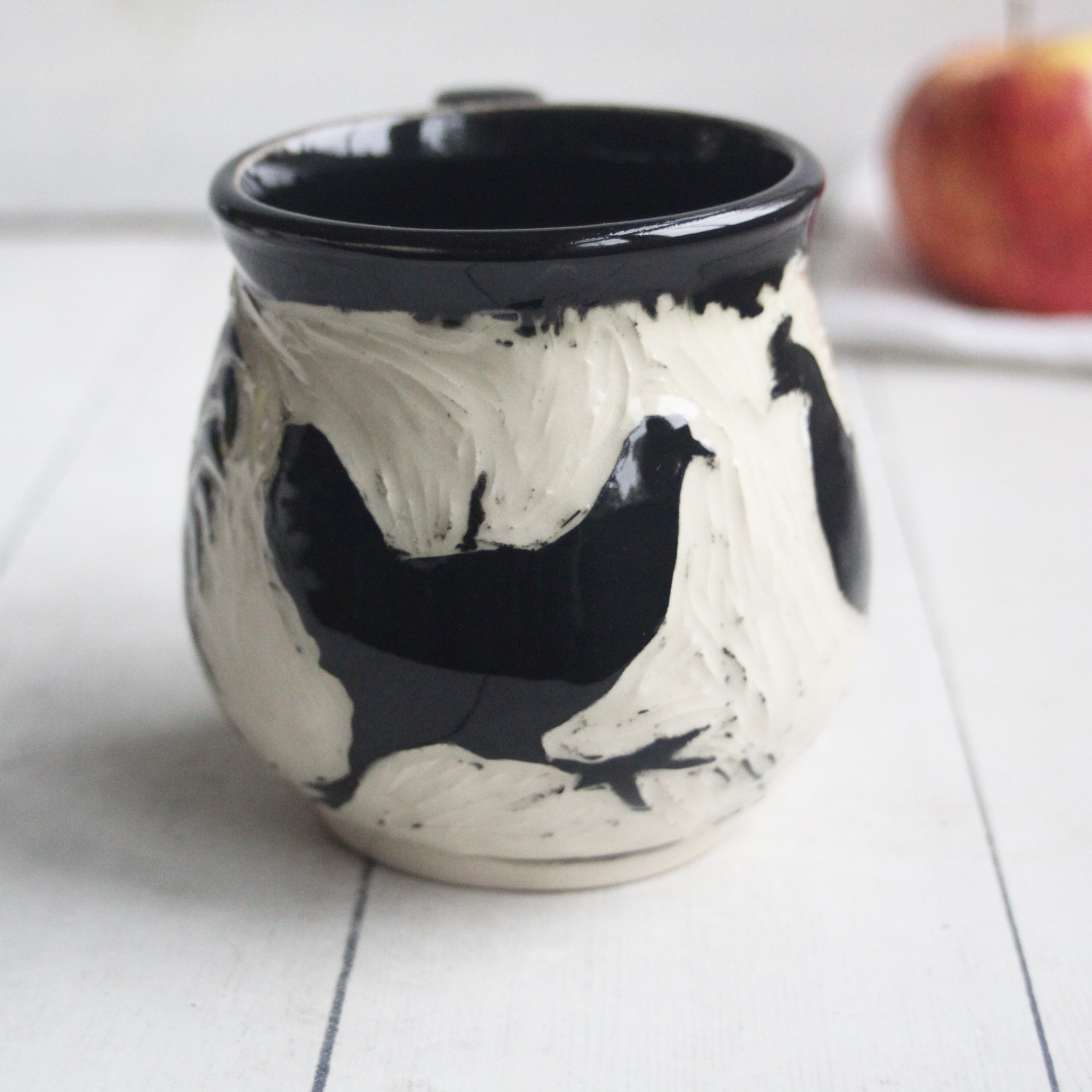 Black and White Chickens Sgraffito Mug, Hand Carved Hens Coffee Cup, 12 oz., Made in USA