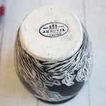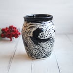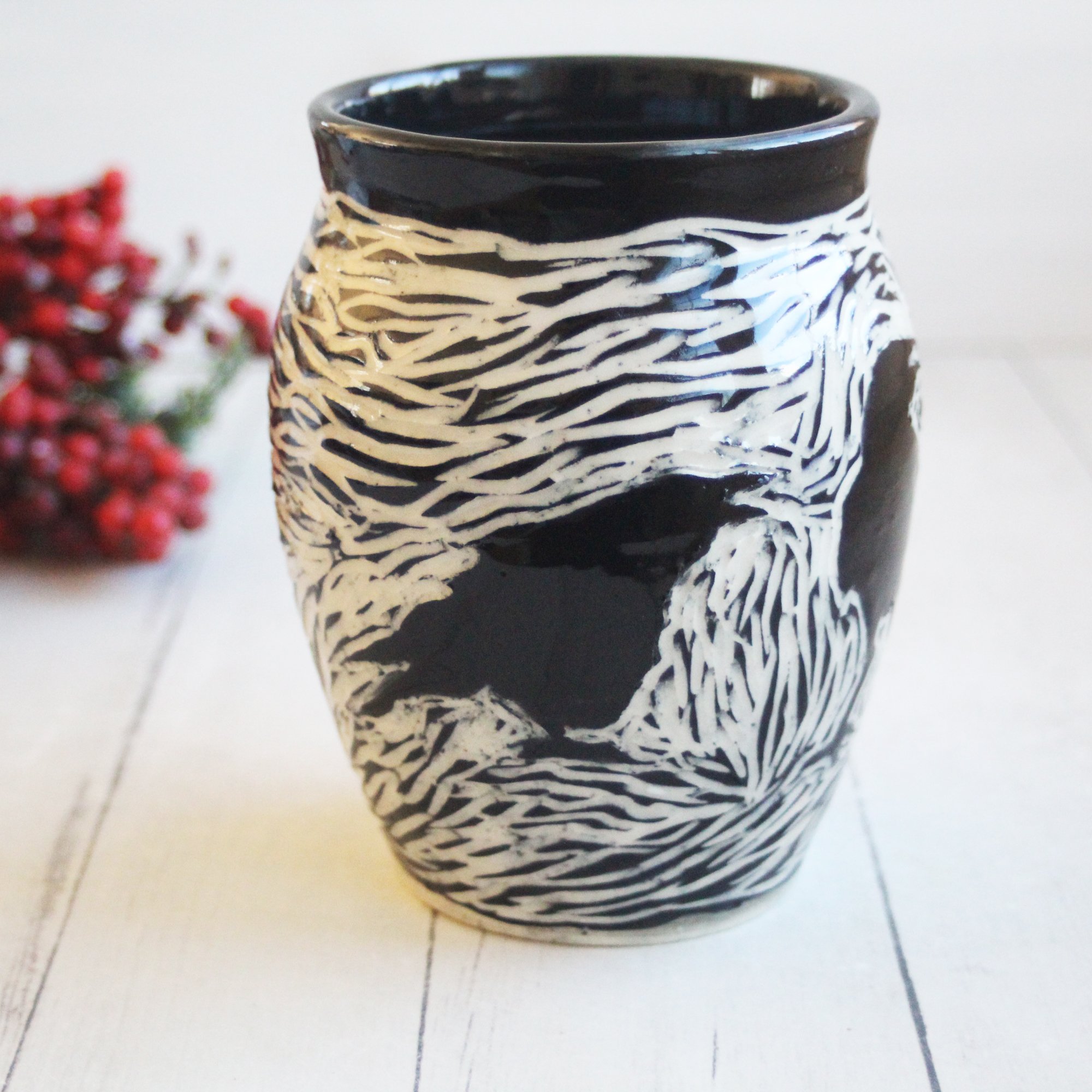 This artful vase was hand thrown and trimmed on my pottery wheel using white stoneware clay, it was then covered with black underglaze, then each bird was hand carved, there are 4 different black ravens carved in the design. This method is called sgraffito. It was then bisque fired and glazed and high fired in my electric kiln. This is a special art vase, it was hand carved and is one of a kind. Approximate size: 5.75" tall and 4.5" wide at the mid section. Shipping is $35 USPS Priority Mail. *If you are sending this as a gift please let me know, I am happy to include a personal message from you to the recipient. View more mugs and cups look here
