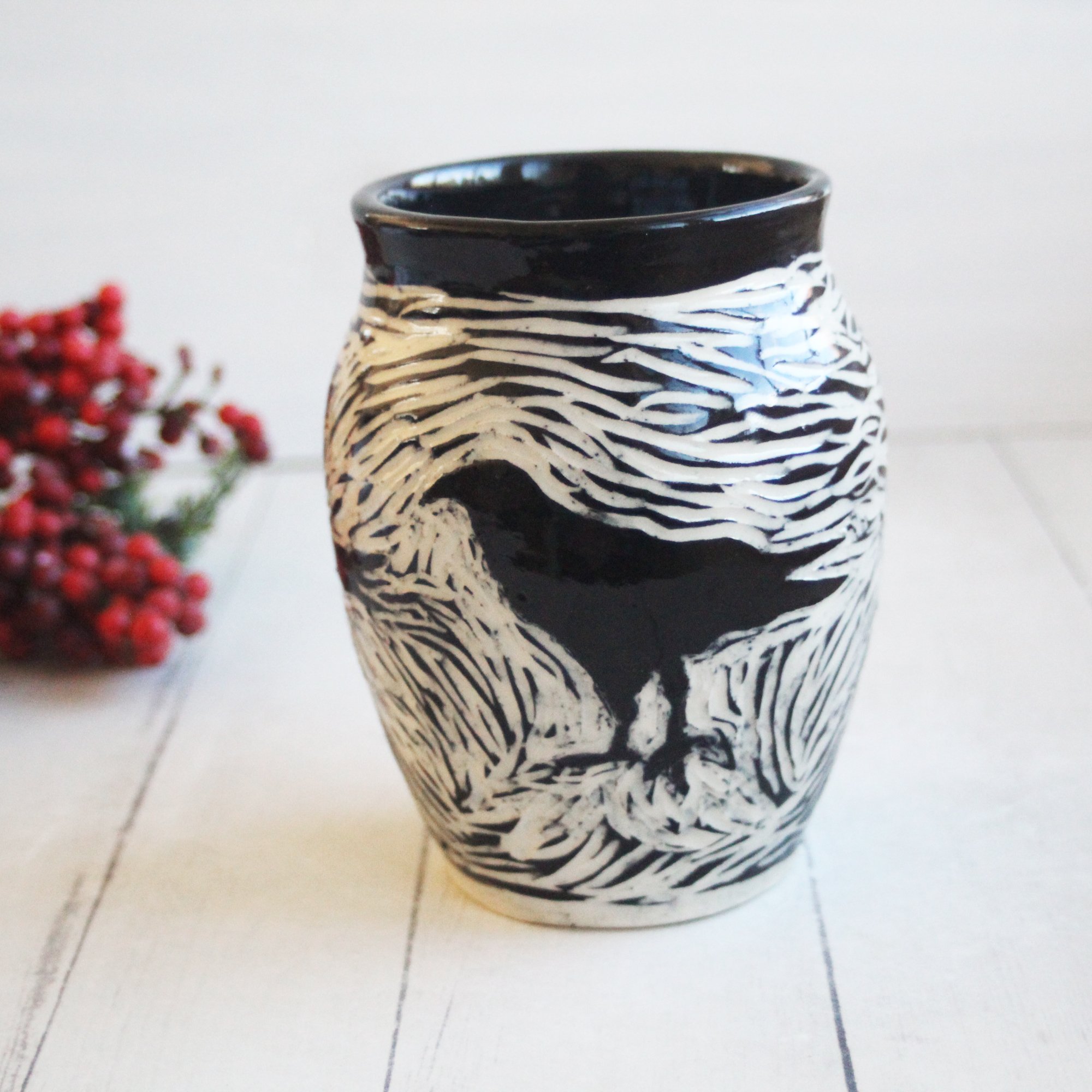 Black Raven Pottery Vase, Hand Carved Black Crow, Art Vase, Made in USA