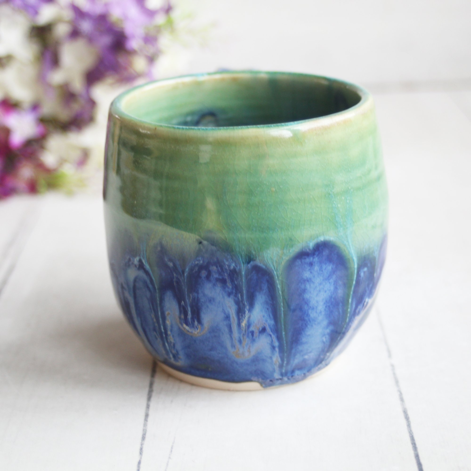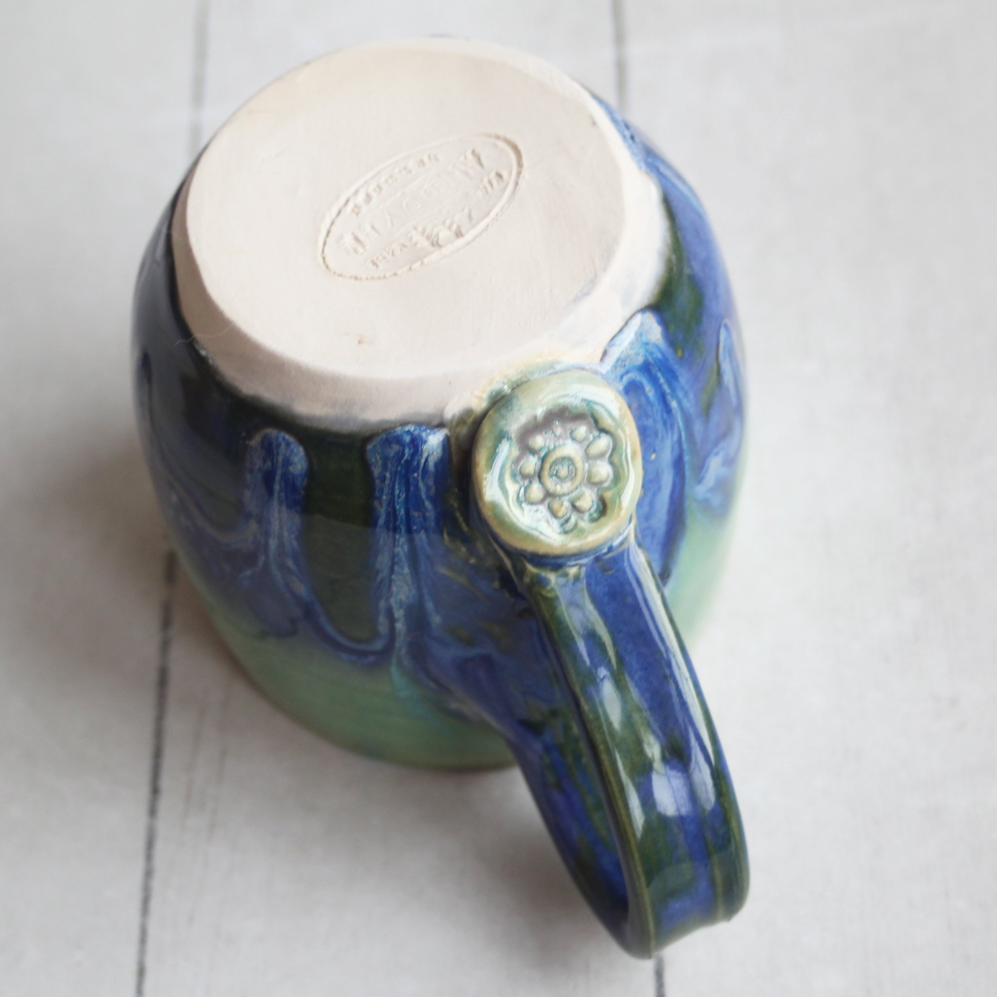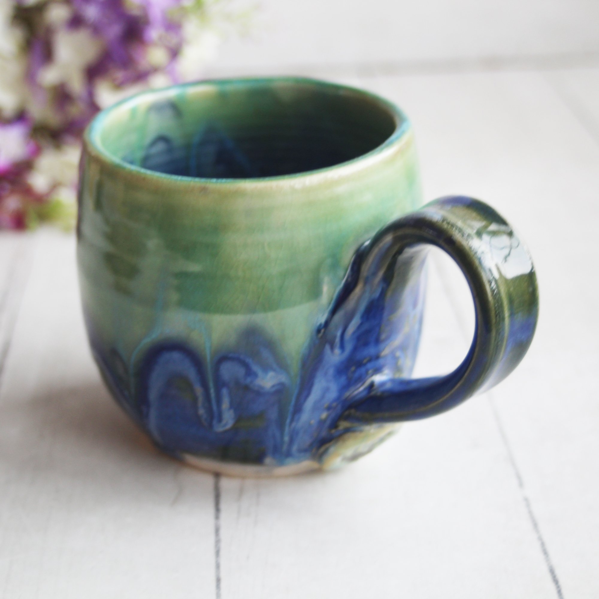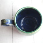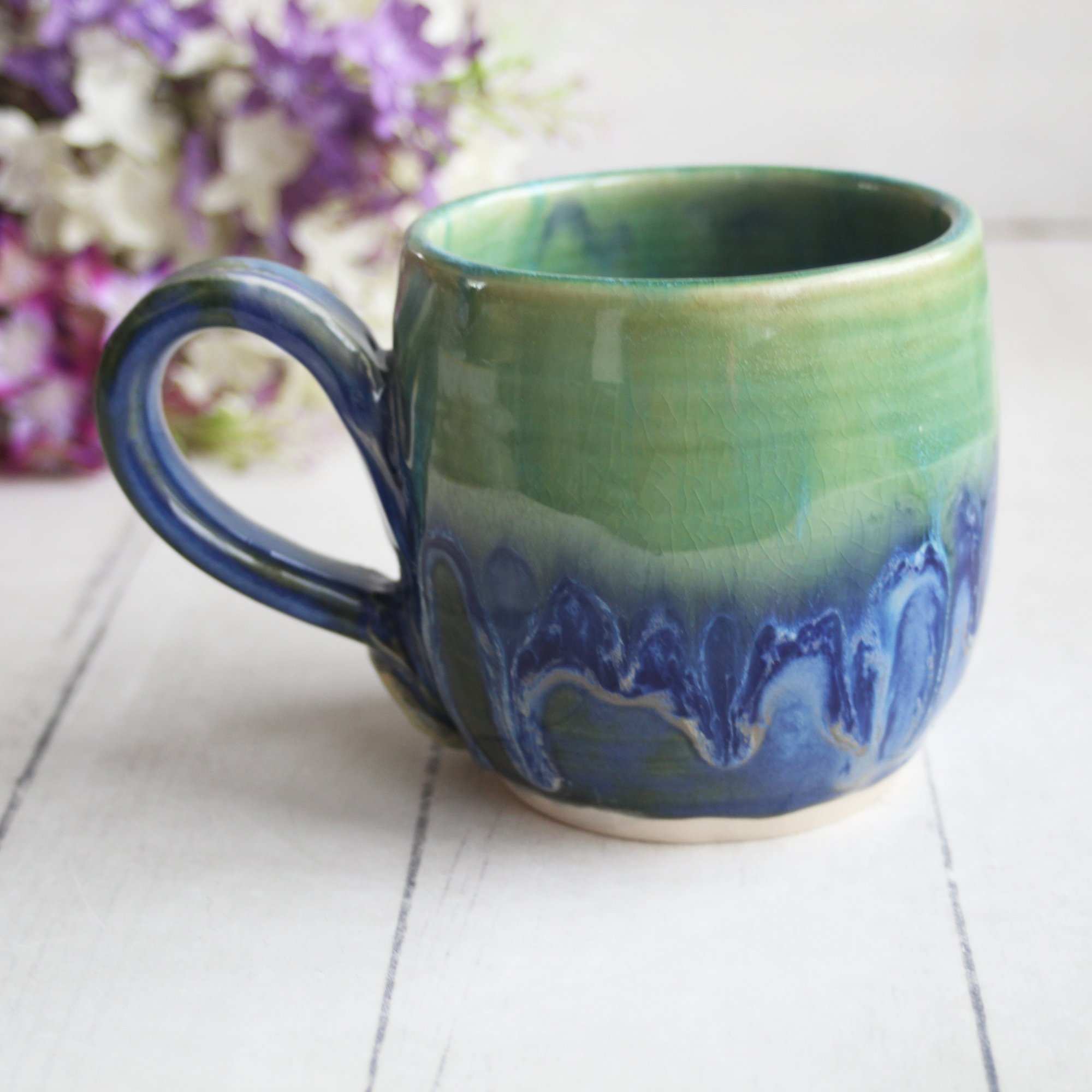 Blue and Green Pottery Mug with Dripping Glazes, 13 oz. Coffee Cup, Handmade in USA