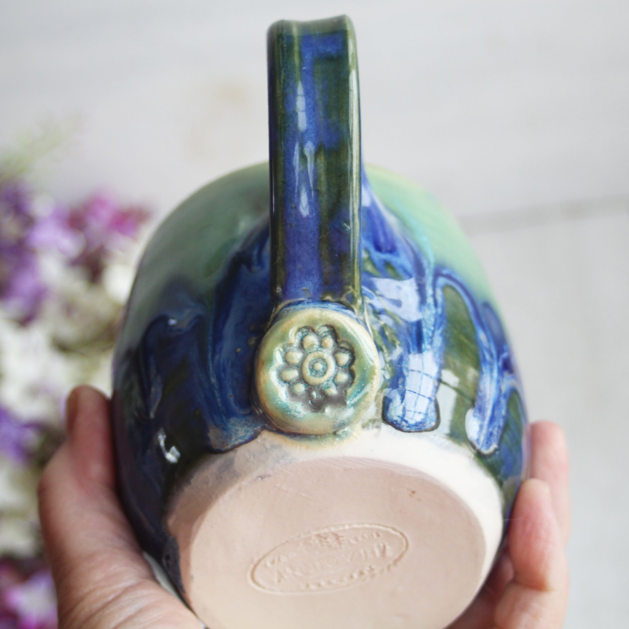 This beautiful mug was hand thrown and trimmed on my pottery wheel using a white stoneware clay. It was bisque fired and glazed with several layers of green and blue glazes and high fired in my electric kiln.