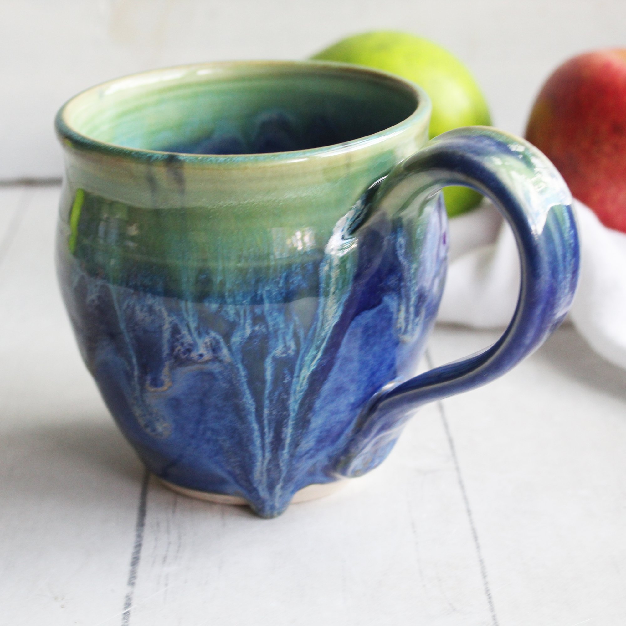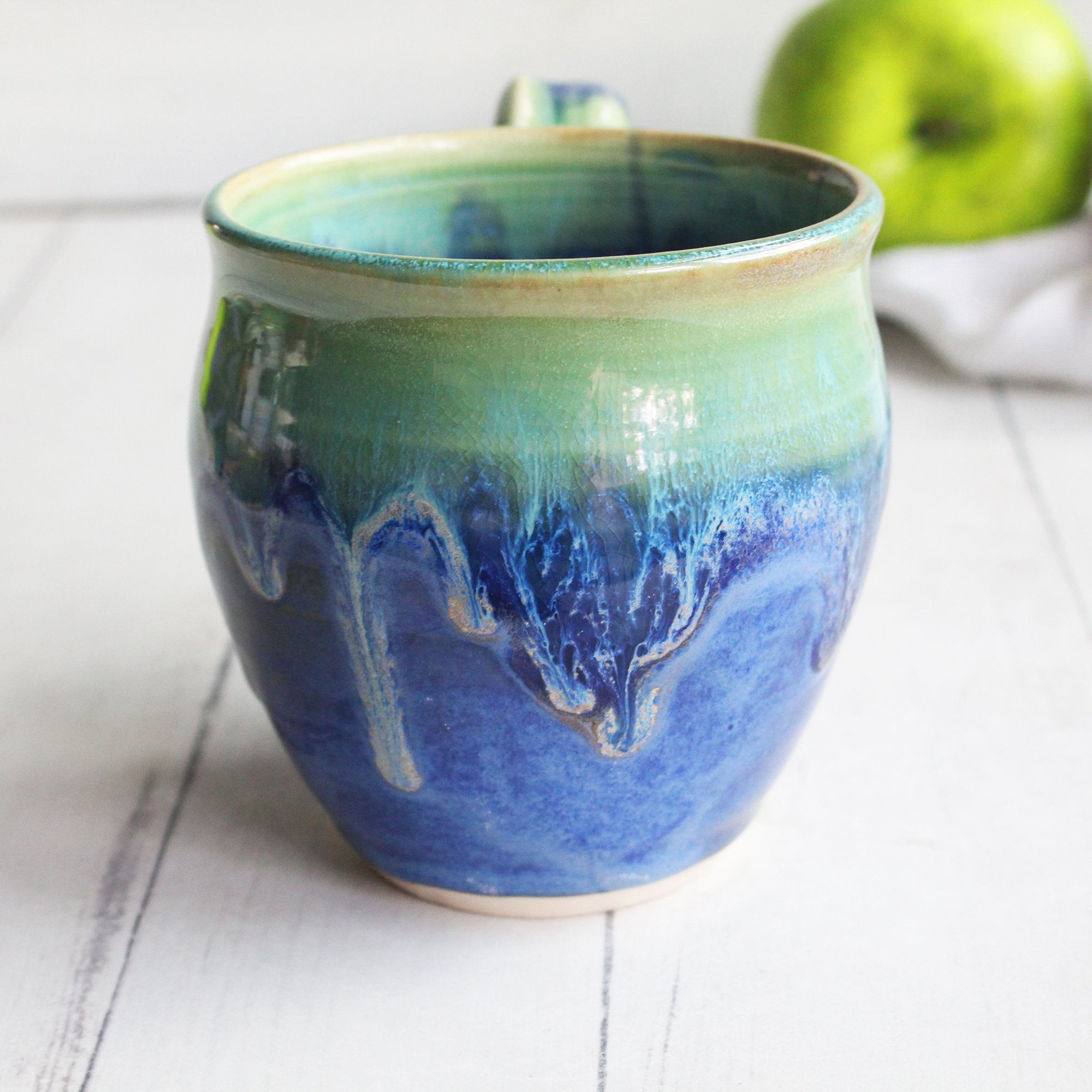 Blue and Green Pottery Mug with Dripping Glazes, 14 oz. Coffee Cup, Handmade in USA