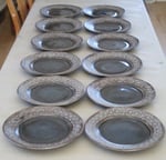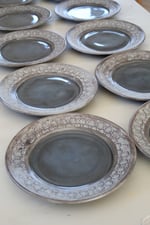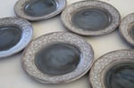 These twelve handmade dinner plates were thrown and trimmed on my potters wheel using a white stoneware clay. They were bisque fired and then hand painted with several coats of charcoal gray and midnight blue glaze. They were then fired to cone 6 in my electric kiln.
