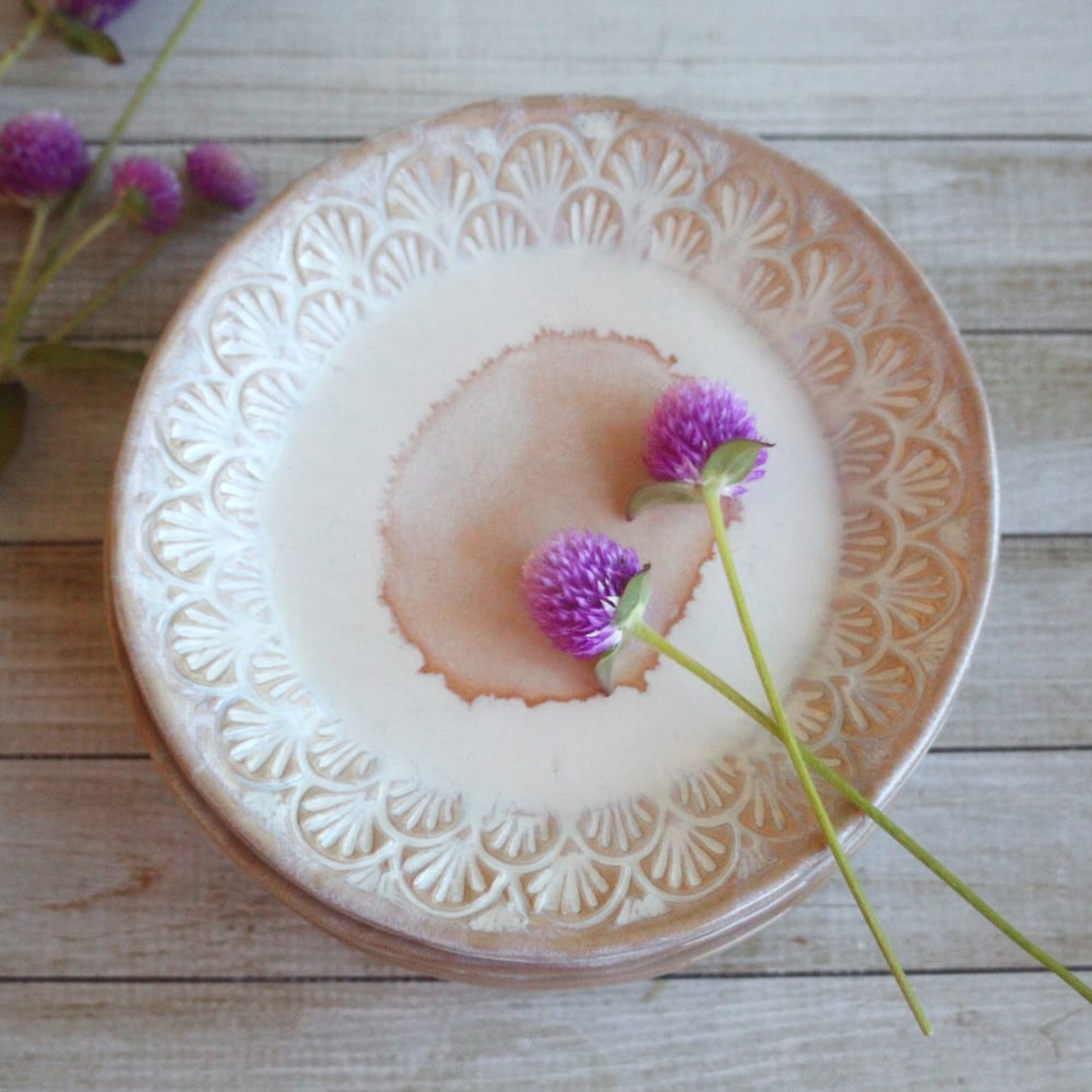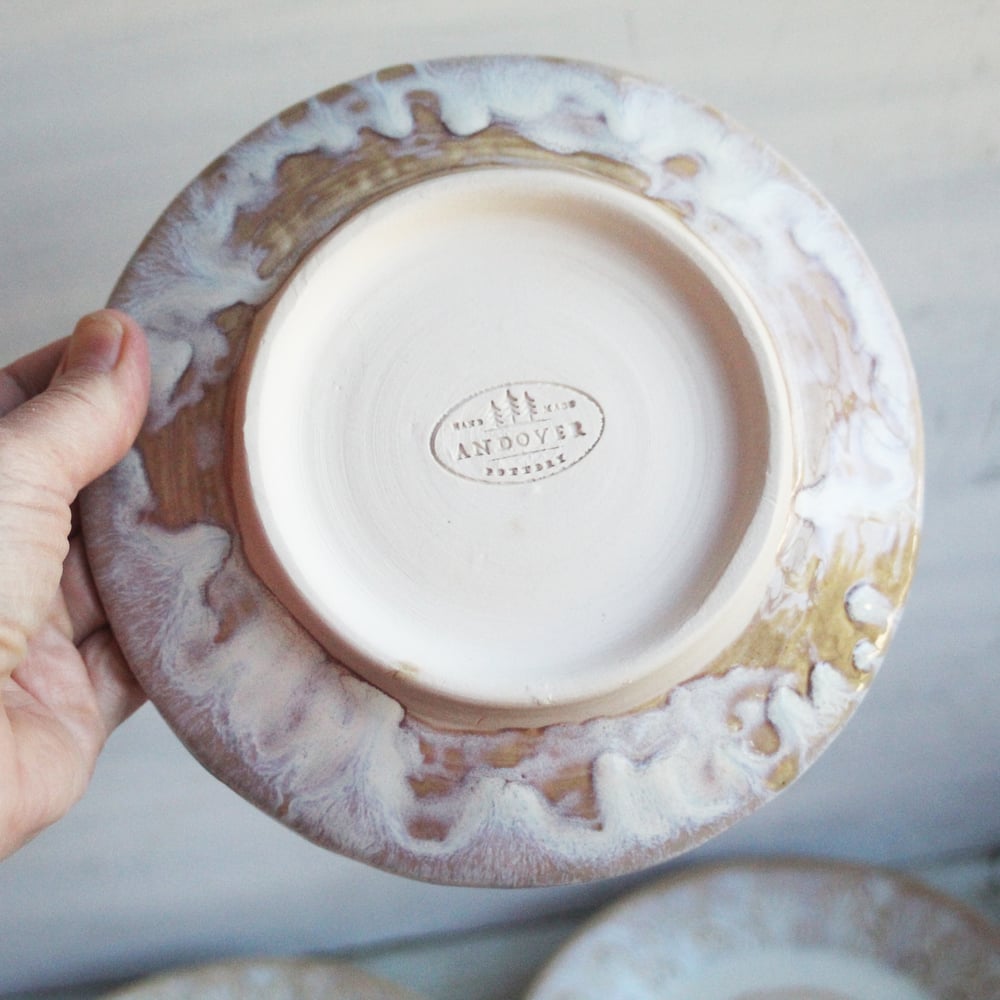 This set of sixteen dessert dishes were handcrafted on my pottery wheel using a white stoneware clay. They each were impressed with a stamp around the rim to create the design and bisque fired in my kiln. Each piece was hand painted with a creamy white and ocher glaze and high fired in my kiln.