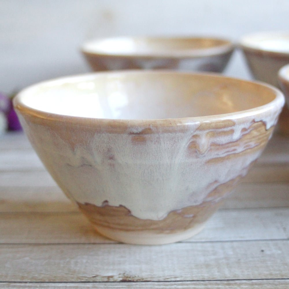 This listing is for sixteen rustic handmade bowls shown in the photos above that were thrown and trimmed on my potters wheel. They were bisque fired and then glazed with milky white rustic glaze that breaks to a toasted ocher and high fired in my electric kiln.