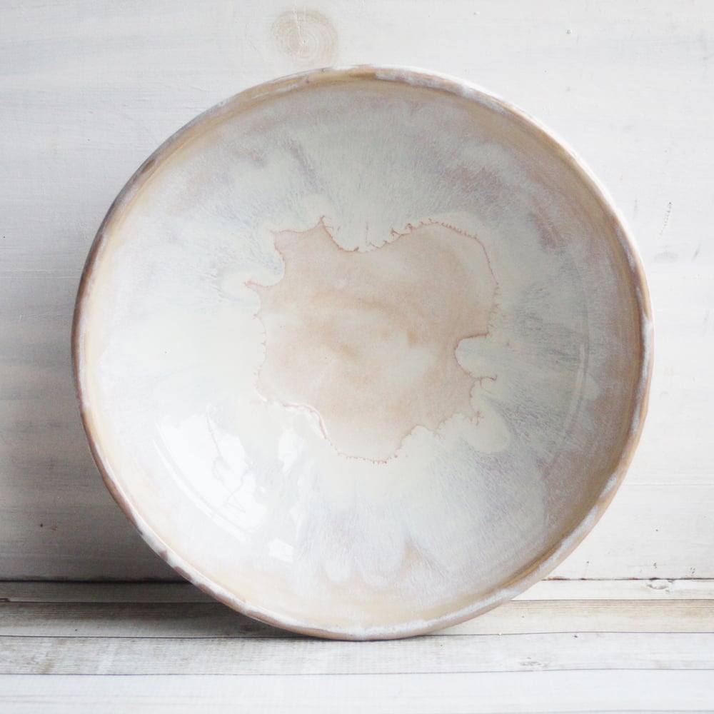 This gorgeous bowl was hand thrown and trimmed on my pottery wheel using a white stoneware clay. It was bisque fired and glazed with beautifully rustic white and ocher glazes and high fired in my electric kiln. This bowl would make a terrific salad bowl or center piece.