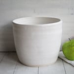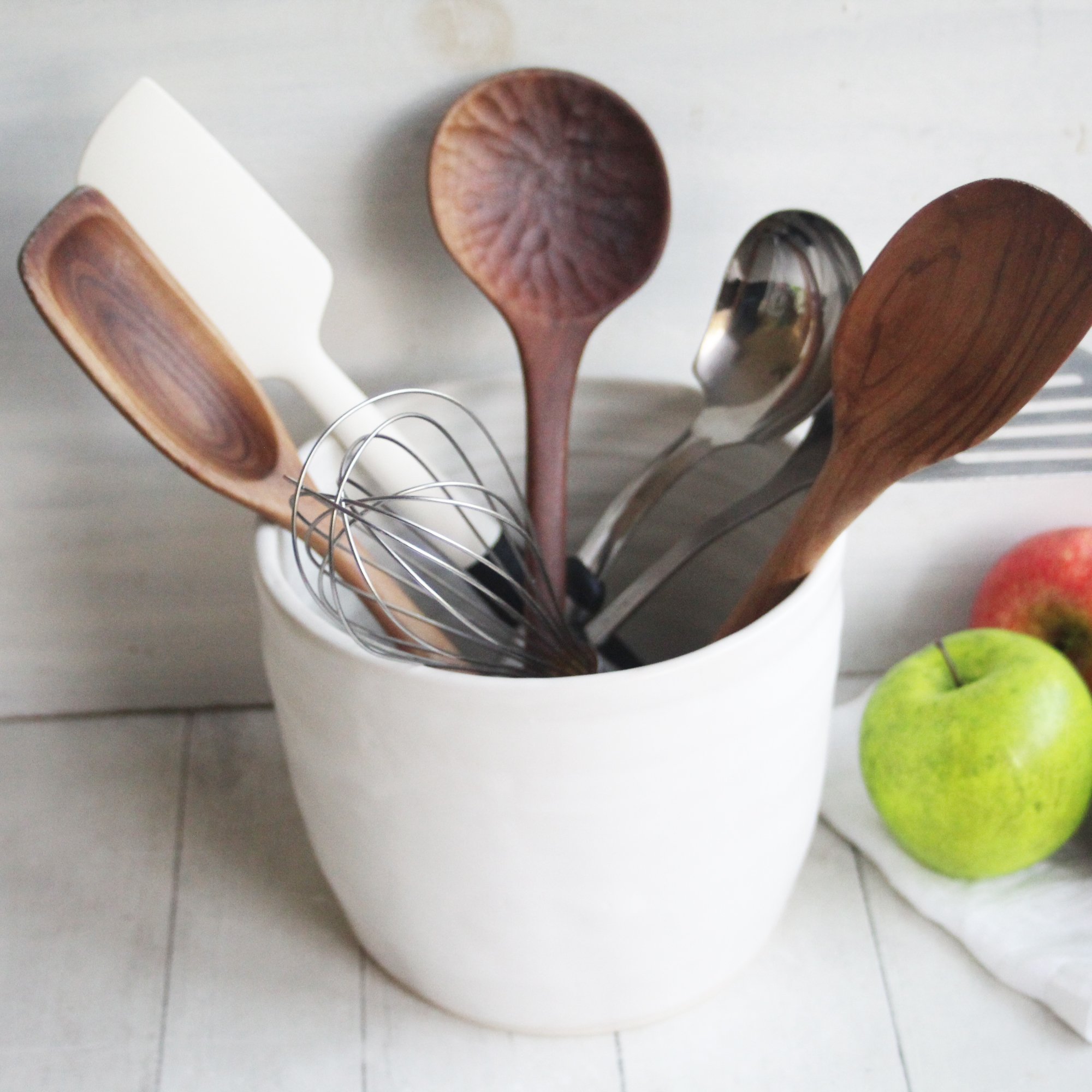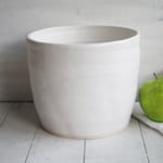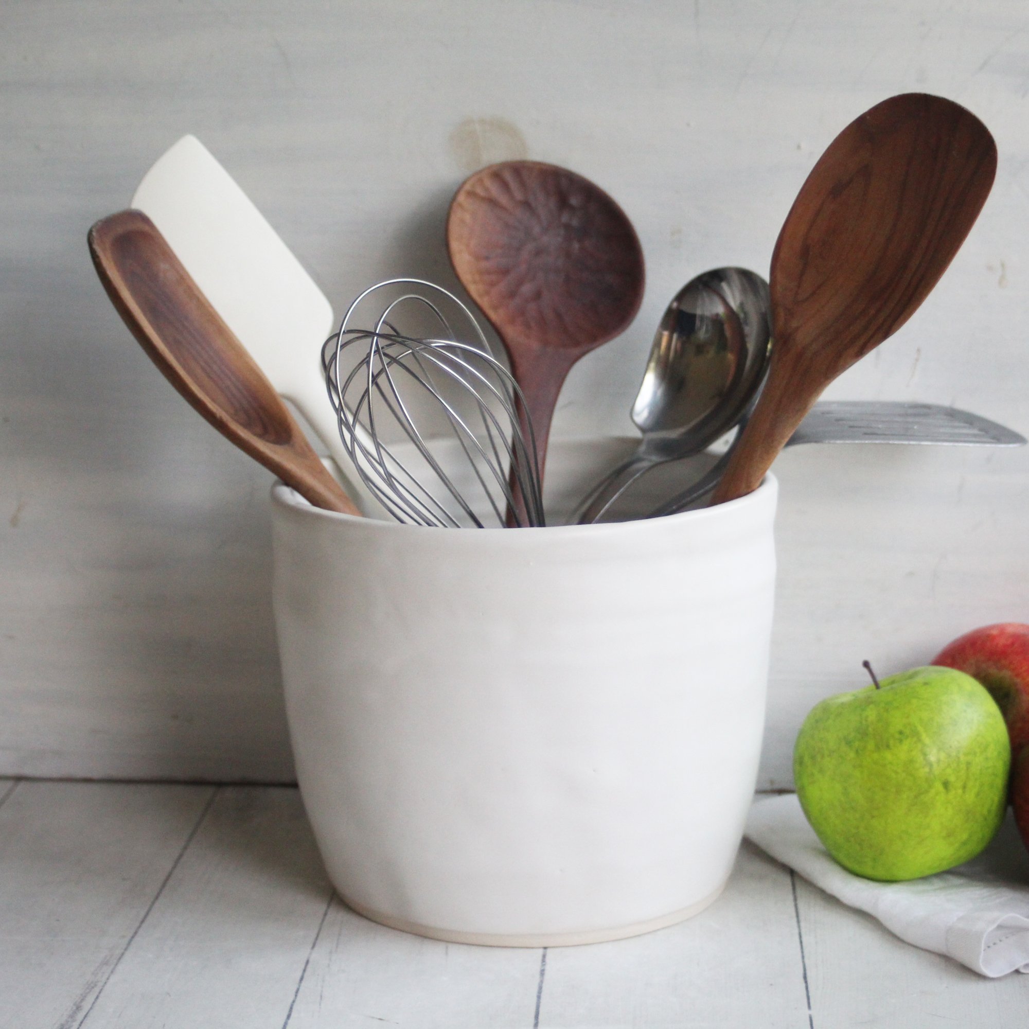 This extra large utensil holder was hand thrown on my pottery wheel using a white stoneware clay. It was bisque fired and glazed with a beautiful rustic matte white glaze and high fired in my electric kiln.