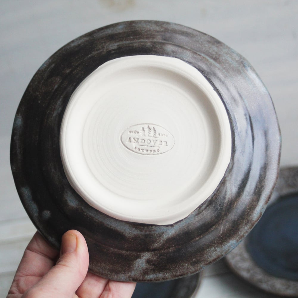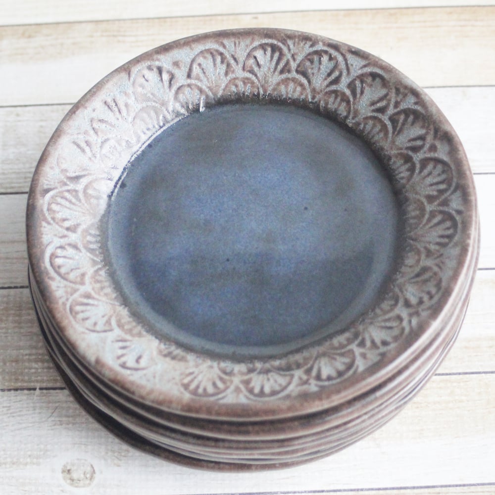 These six handmade dessert plates were thrown and trimmed on my potters wheel using a white stoneware clay. They were bisque fired and then hand painted with several coats of charcoal gray and midnight blue glaze. They were then fired to cone 6 in my electric kiln. Approximate sizes: Dessert dish 6.5" and 2.5" high. *Each piece varies slightly in color and shape making it no doubt that they are handcrafted, rustic and unique. *Dishwasher and microwave safe.