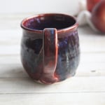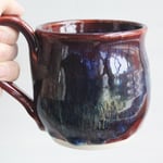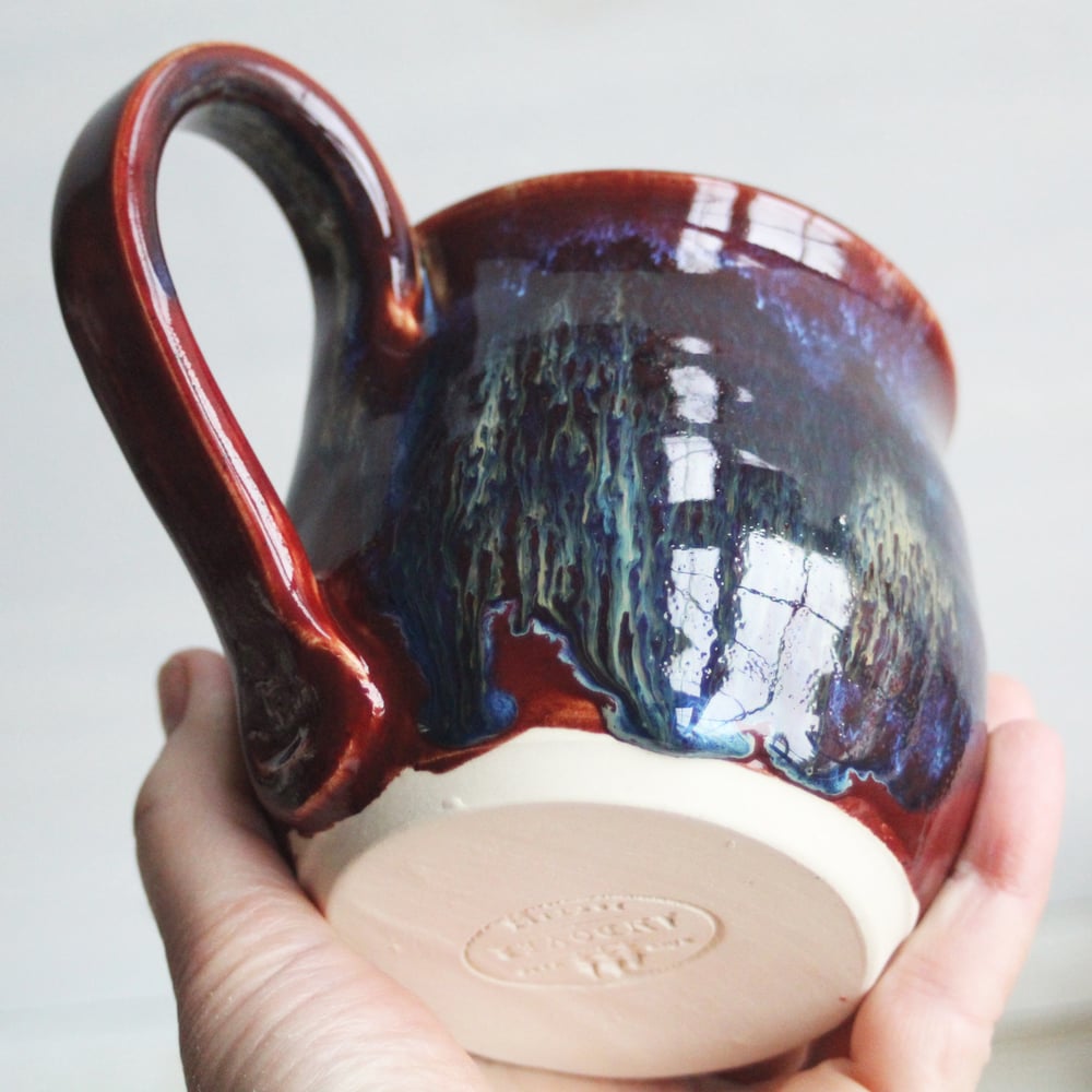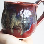 Deep Red with Melting Blue and Gold Glazed Pottery Mug, 13 Ounce Handcrafted Coffee Cup, Made in USA