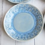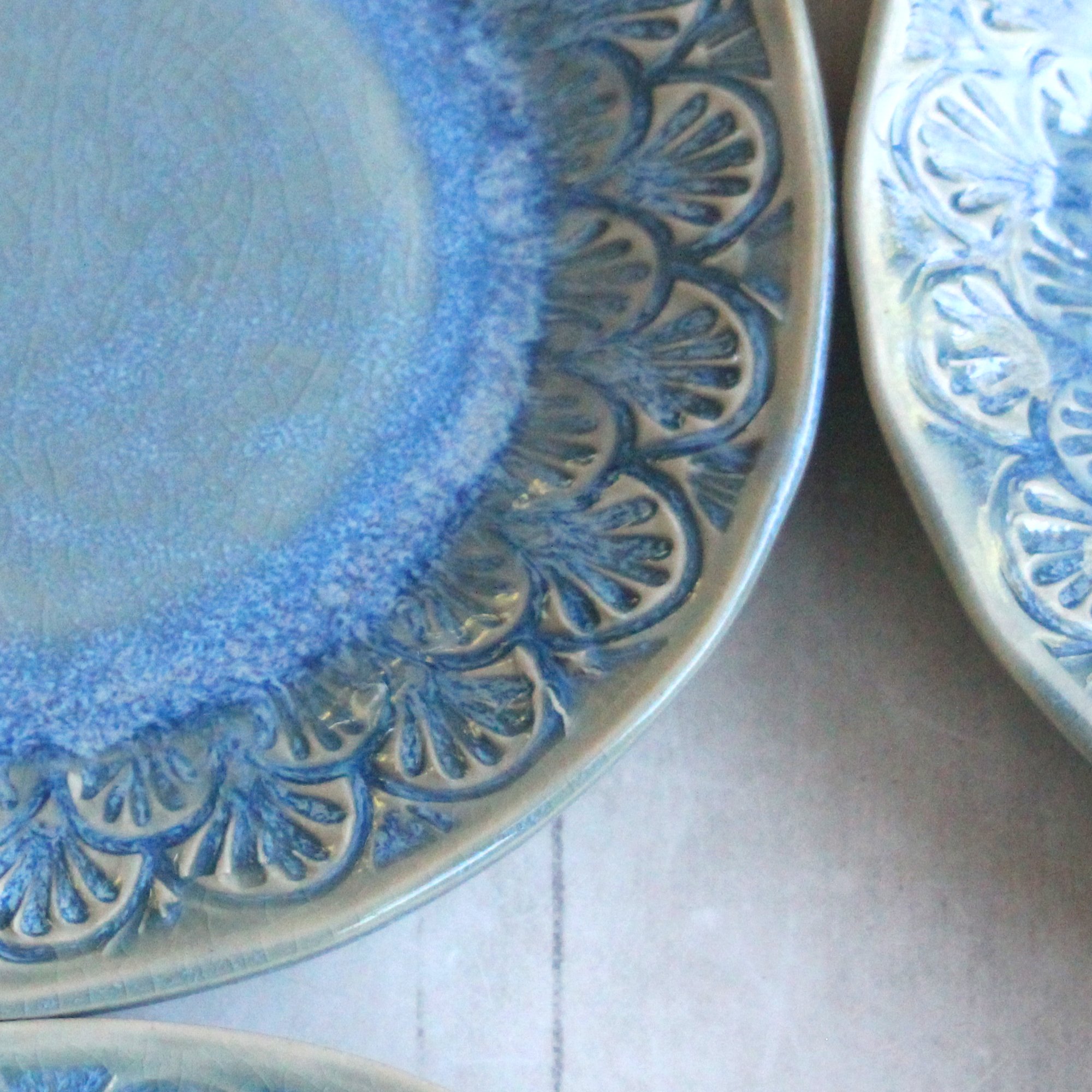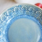 This set of four dessert dishes were handcrafted on my pottery wheel using a white stoneware clay. They were impressed around the rim with a wooden rolling stamp and bisque fired in my kiln. Each piece was hand painted with a gorgeous sea glass blue glaze and high fired in my kiln.