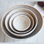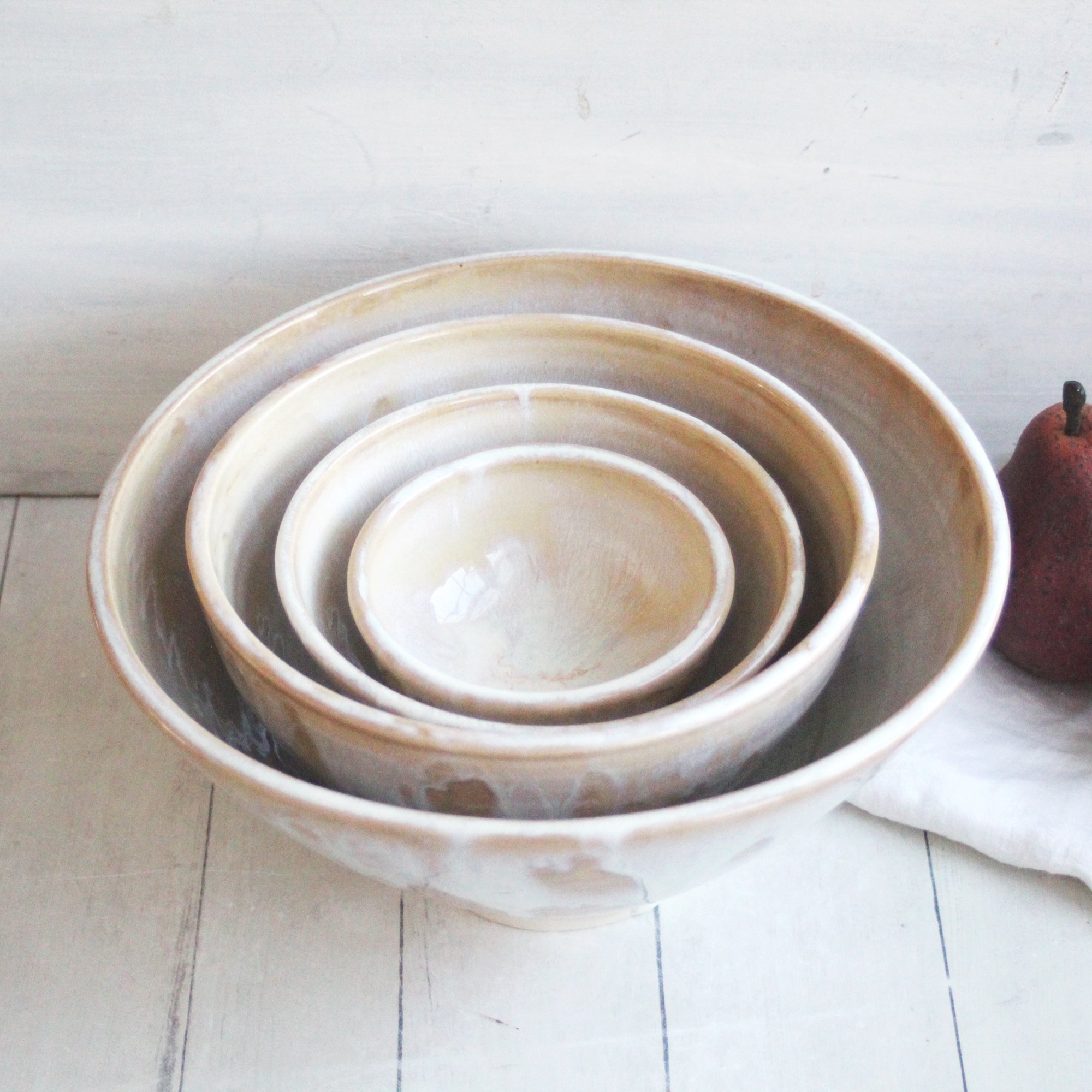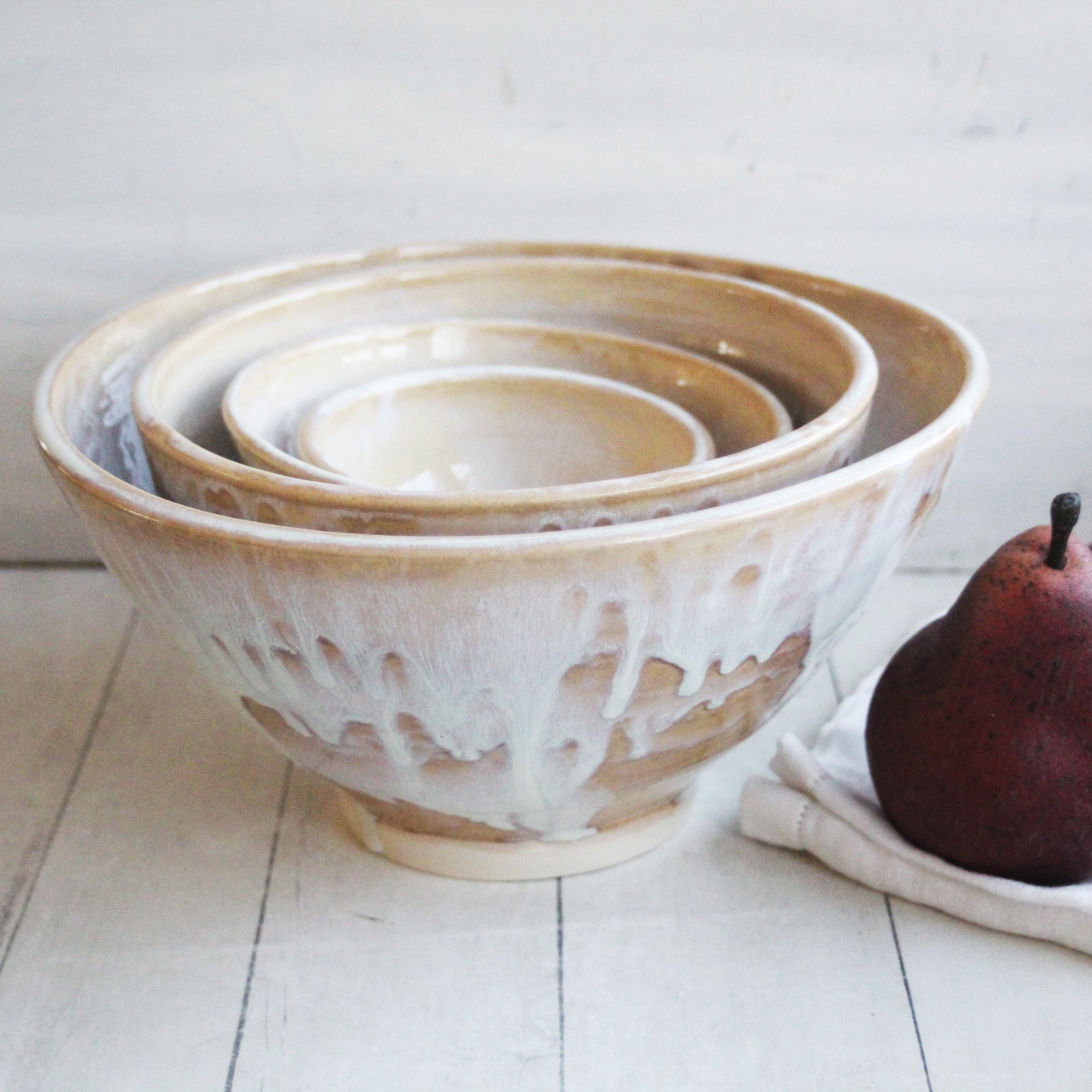 Ceramic Nesting Bowls In Rustic White and Ocher Glaze, Set of Four Pottery Bowls, Made in USA