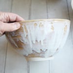 These four rustic bowls were hand thrown and trimmed on my pottery wheel using a white stoneware clay. They were bisque fired and glazed with a gorgeous dripping white glaze that breaks to amber and honey. It was then high fired in my electric kiln.