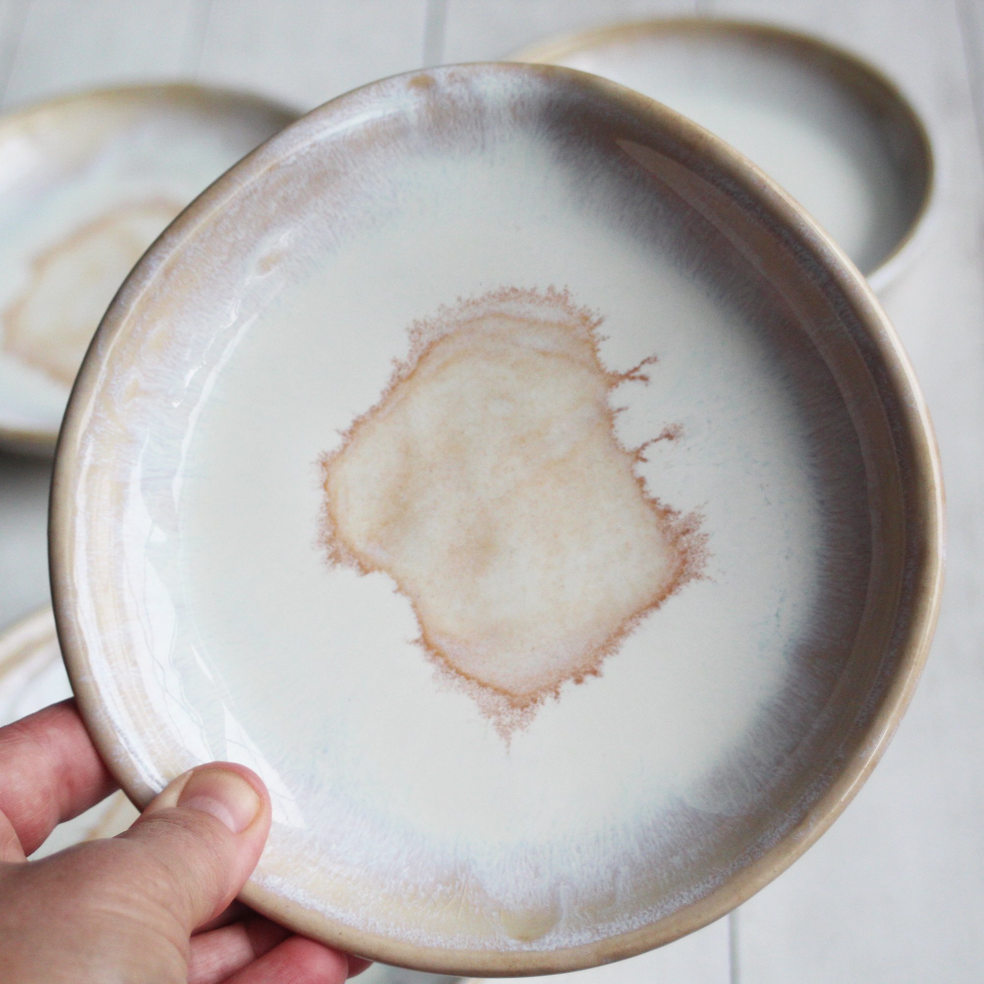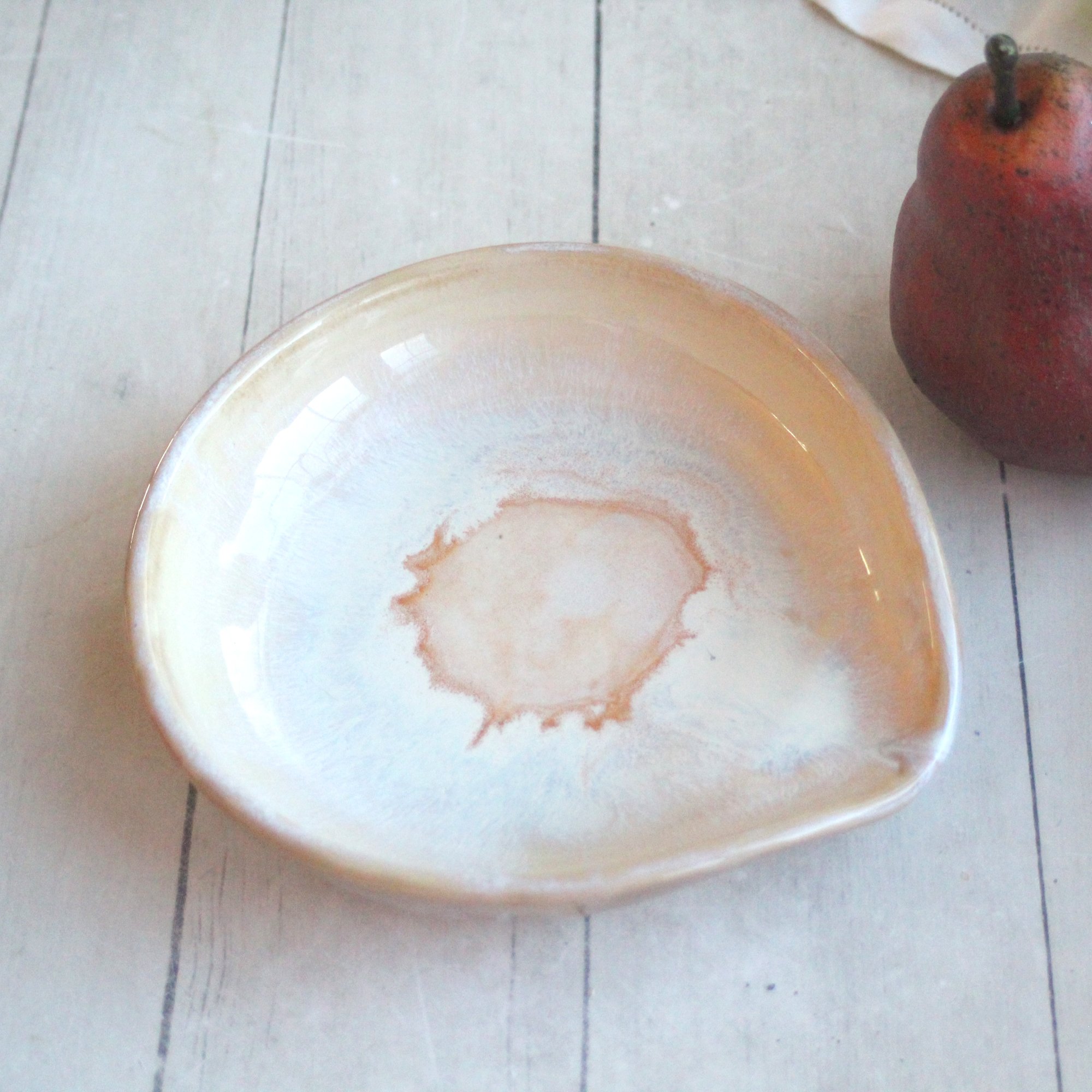 This spoon rest was thrown and trimmed on my pottery wheel using a white stoneware clay. It was bisque fired and glazed with a beautiful white creamy glaze and was then high fired in my electric kiln. This spoon rest is great for serious home chefs, this will hold a large label or mixing spoon and keep the mess off your counter. Sizes range approximately from size: 6.5-7" wide and 1.5" high Dishwasher safe Shipping is $17 for USPS Priority mail. *These are stock photos, your spoon rest will be very similar to the ones shown but will vary slightly due to each being handmade.