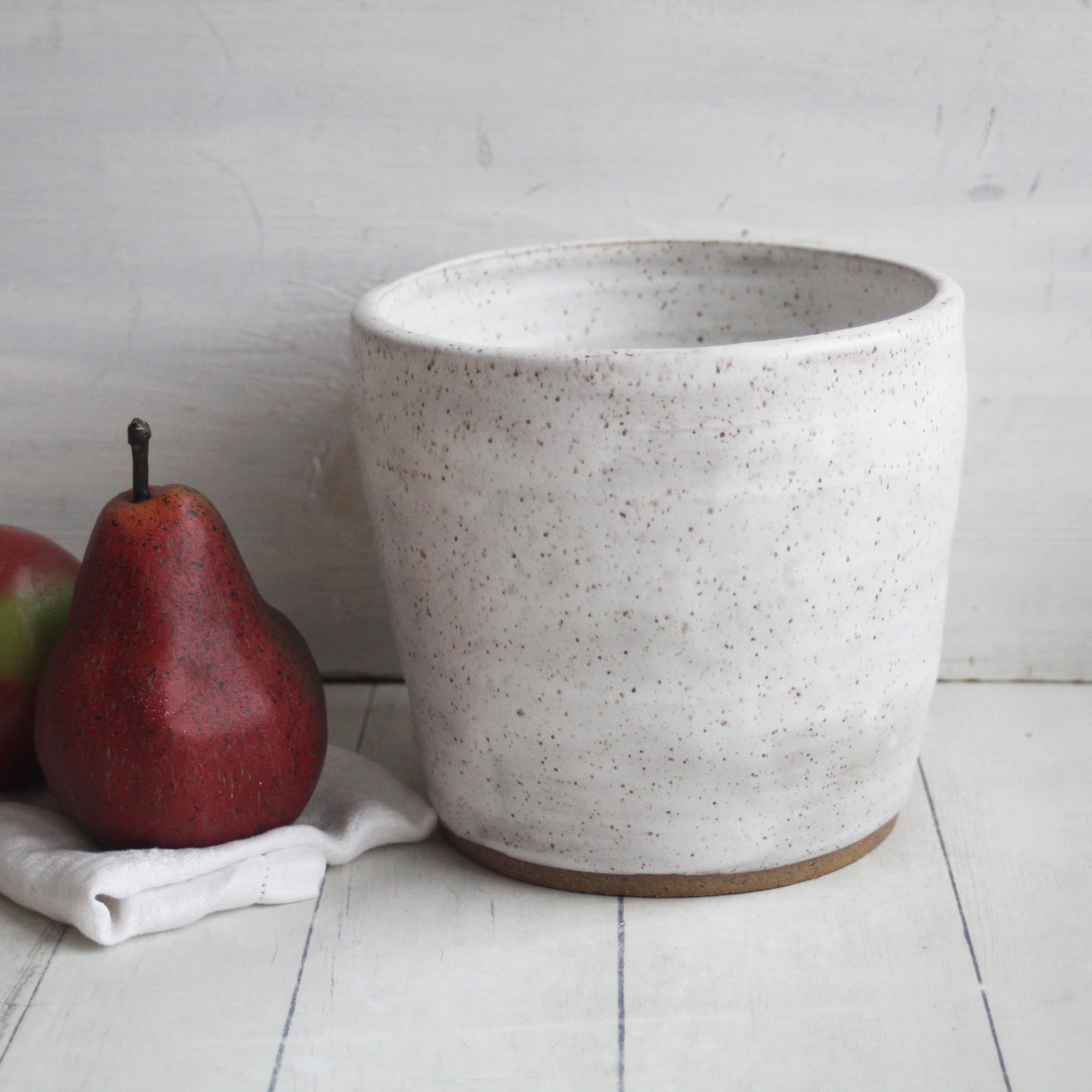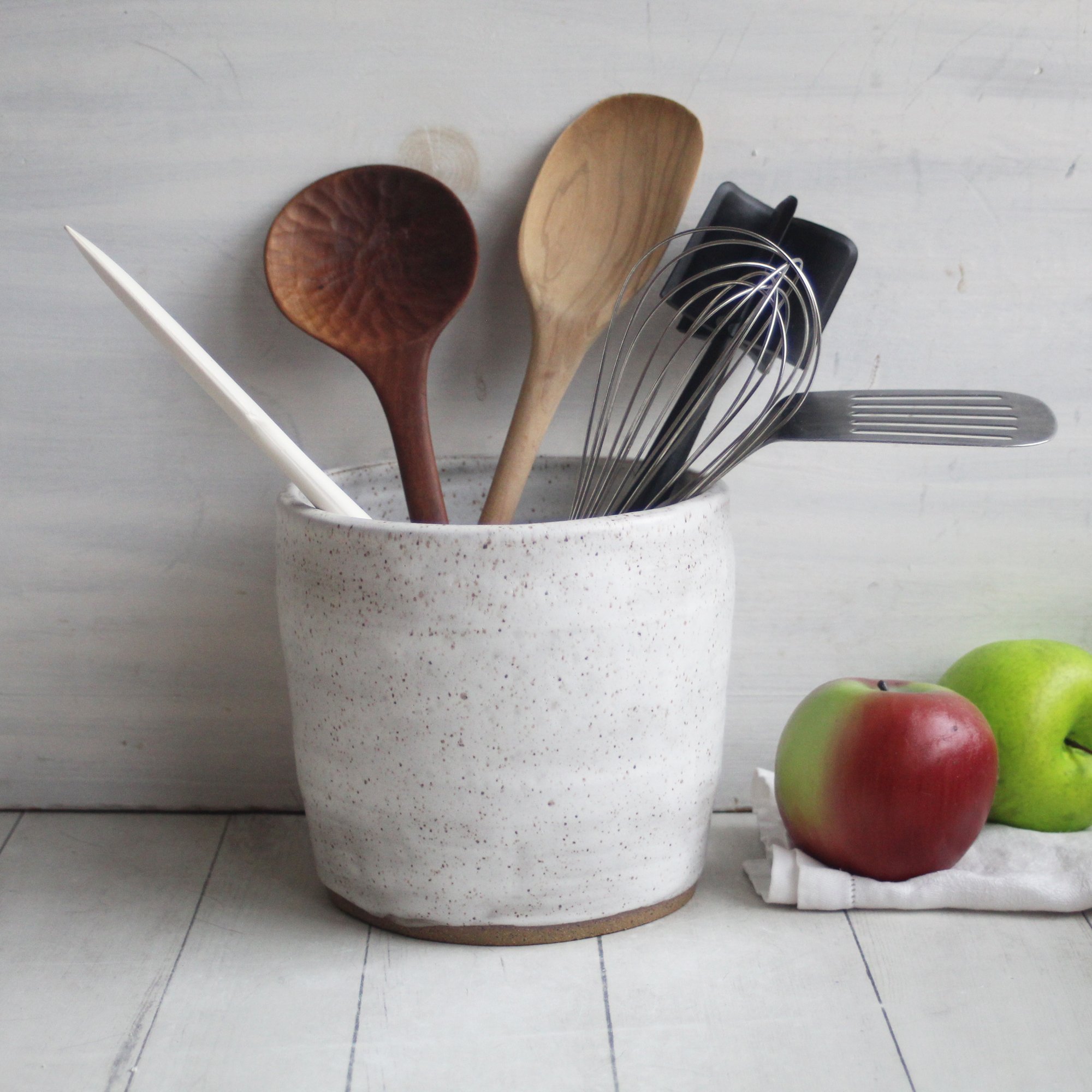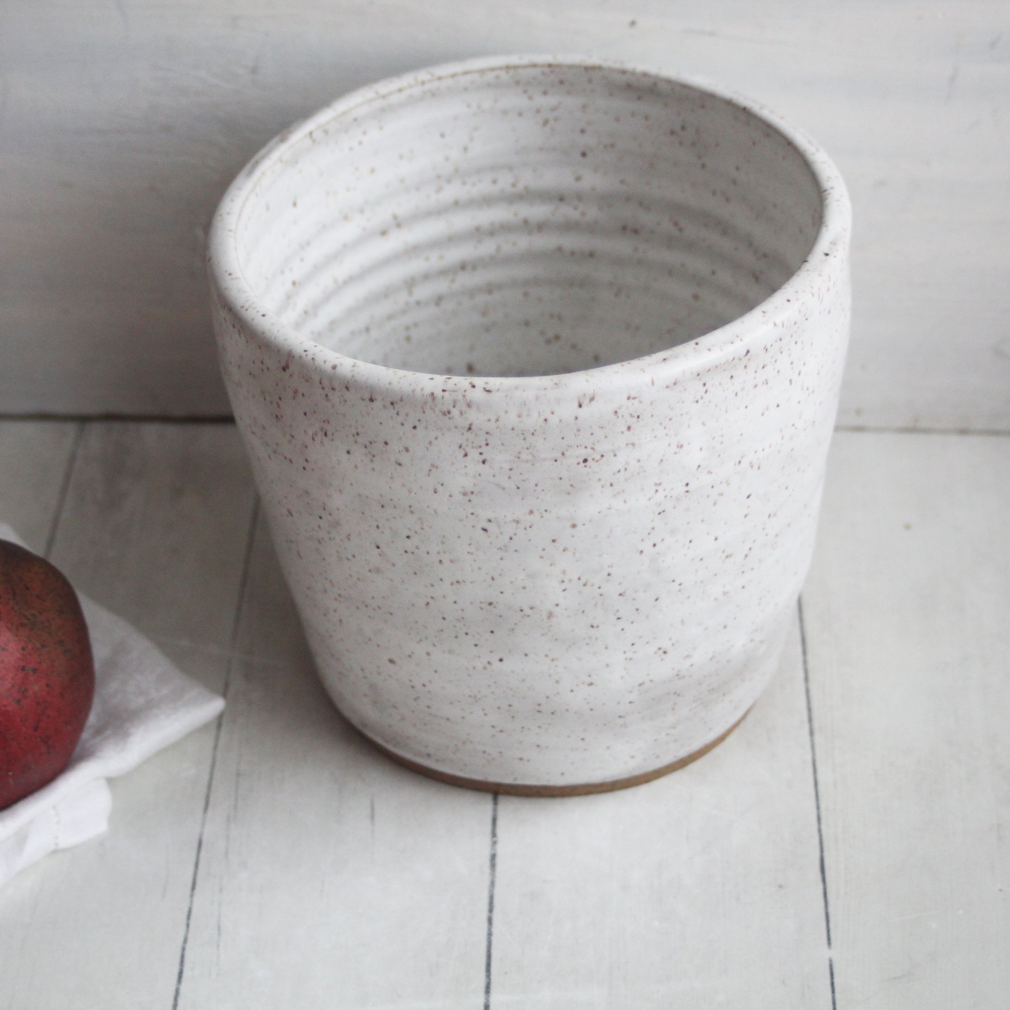This large utensil holder was hand thrown on my pottery wheel using a brown speckled stoneware clay. It was bisque fired and glazed with a beautiful rustic matte white glaze that allows the natural speckling of the clay to show through and high fired in my electric kiln.