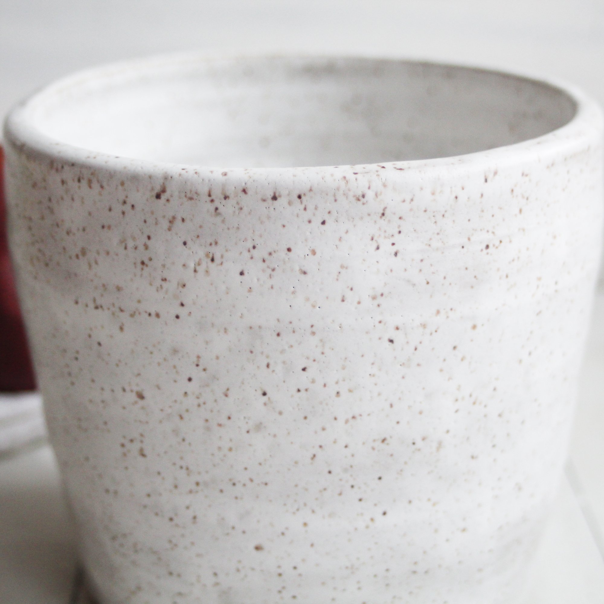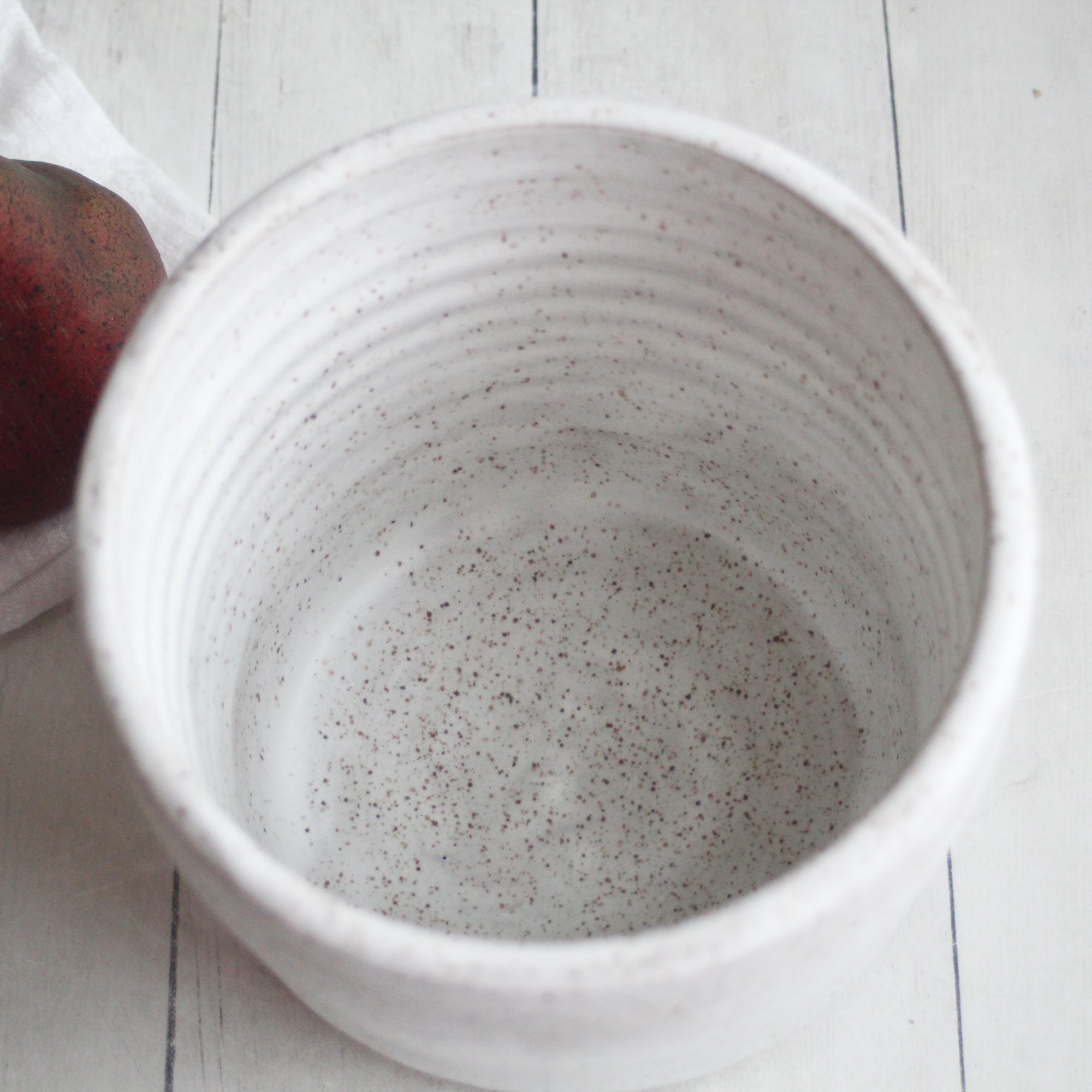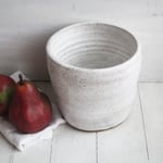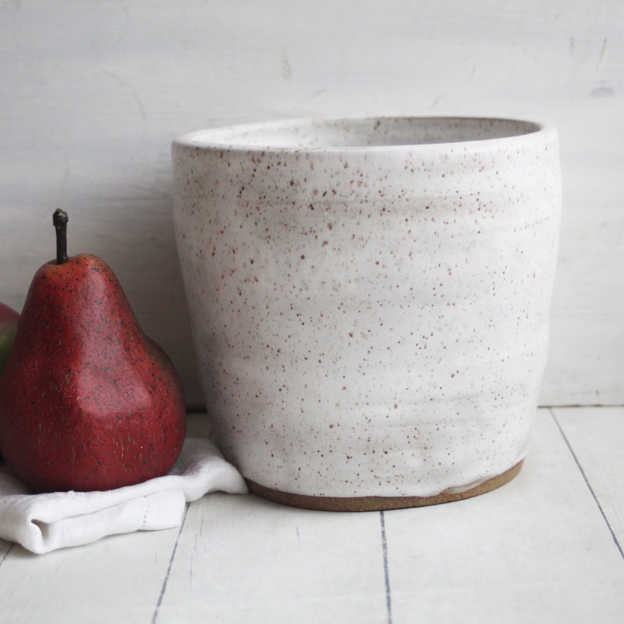 This large utensil holder was hand thrown on my pottery wheel using a brown speckled stoneware clay. It was bisque fired and glazed with a beautiful rustic matte white glaze that allows the natural speckling of the clay to show through and high fired in my electric kiln.