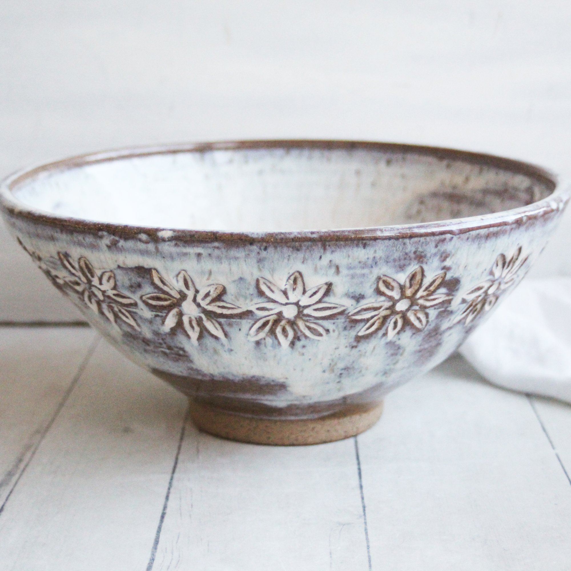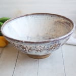This beautiful rustic bowl was hand thrown and trimmed on my potter's wheel using a speckled brown stoneware clay. Each flower was hand carved around the outer rim to create the daisy design. It was bisque fired and then glazed with a beautiful milky white glaze that allows the speckled brown clay to show through. It was then high fired in my electric kiln.