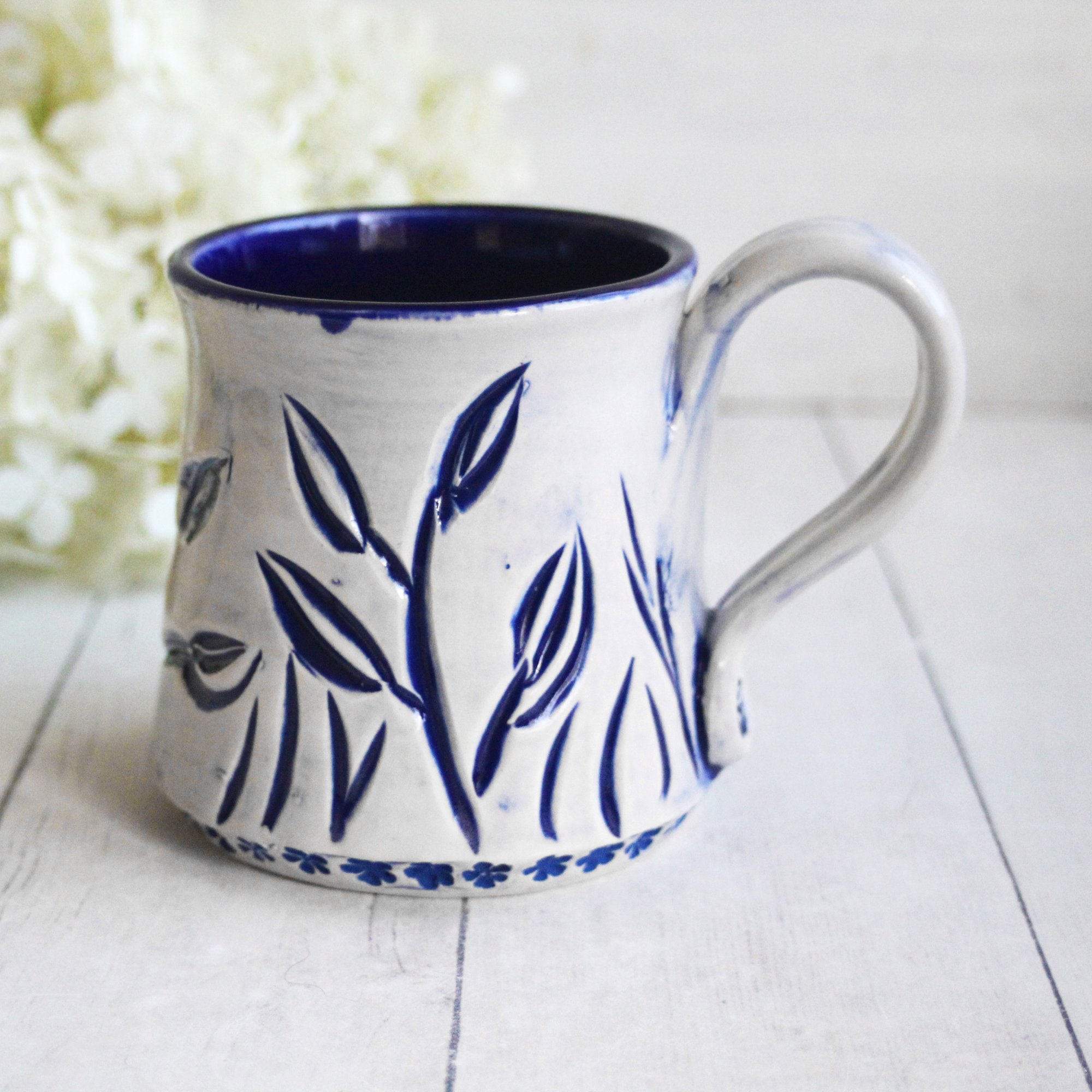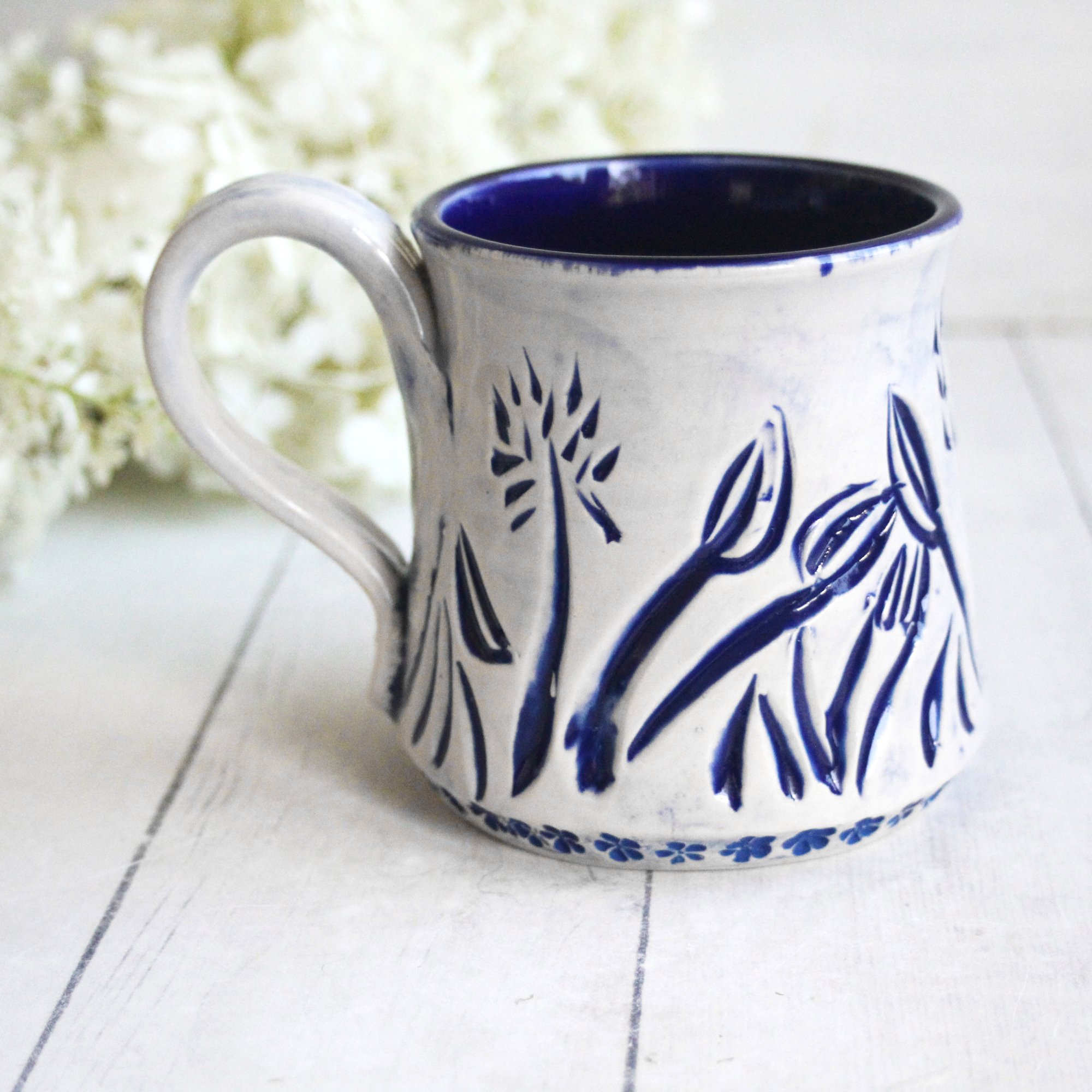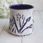 Hand Carved Dark Blue Stoneware Mug, Hand Carved Pottery Mug, Made in USA
