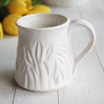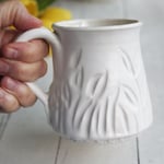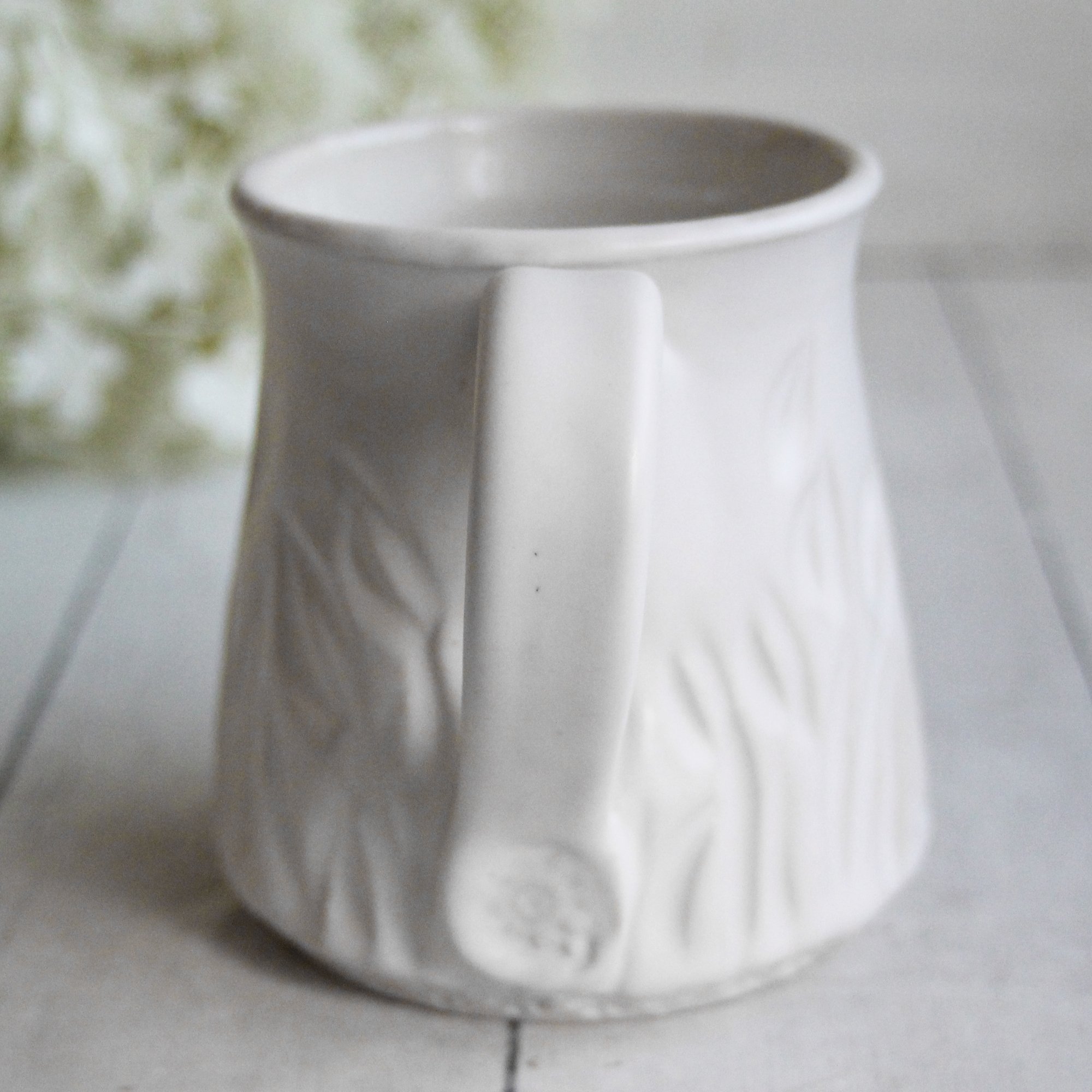 Hand Carved Satin White Stoneware Mug, 14 Ounce Pottery Mug, Made in USA