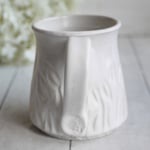 This rustic mug was hand thrown and trimmed and carved on my pottery wheel using a white stoneware clay. It was bisque fired and glazed with a satin white glaze. It was then high fired in my electric kiln.