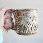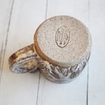 This rustic mug was hand thrown and trimmed on my pottery wheel using a brown speckled stoneware clay. There is a soft botanical design carved free hand around the mid section of the mug. It also has a little floral button on the top of the handle for a thumb rest. It was then bisque fired and glazed with a dripping white translucent glaze that allows the natural speckling of the clay to show through. It was then high fired in my electric kiln.