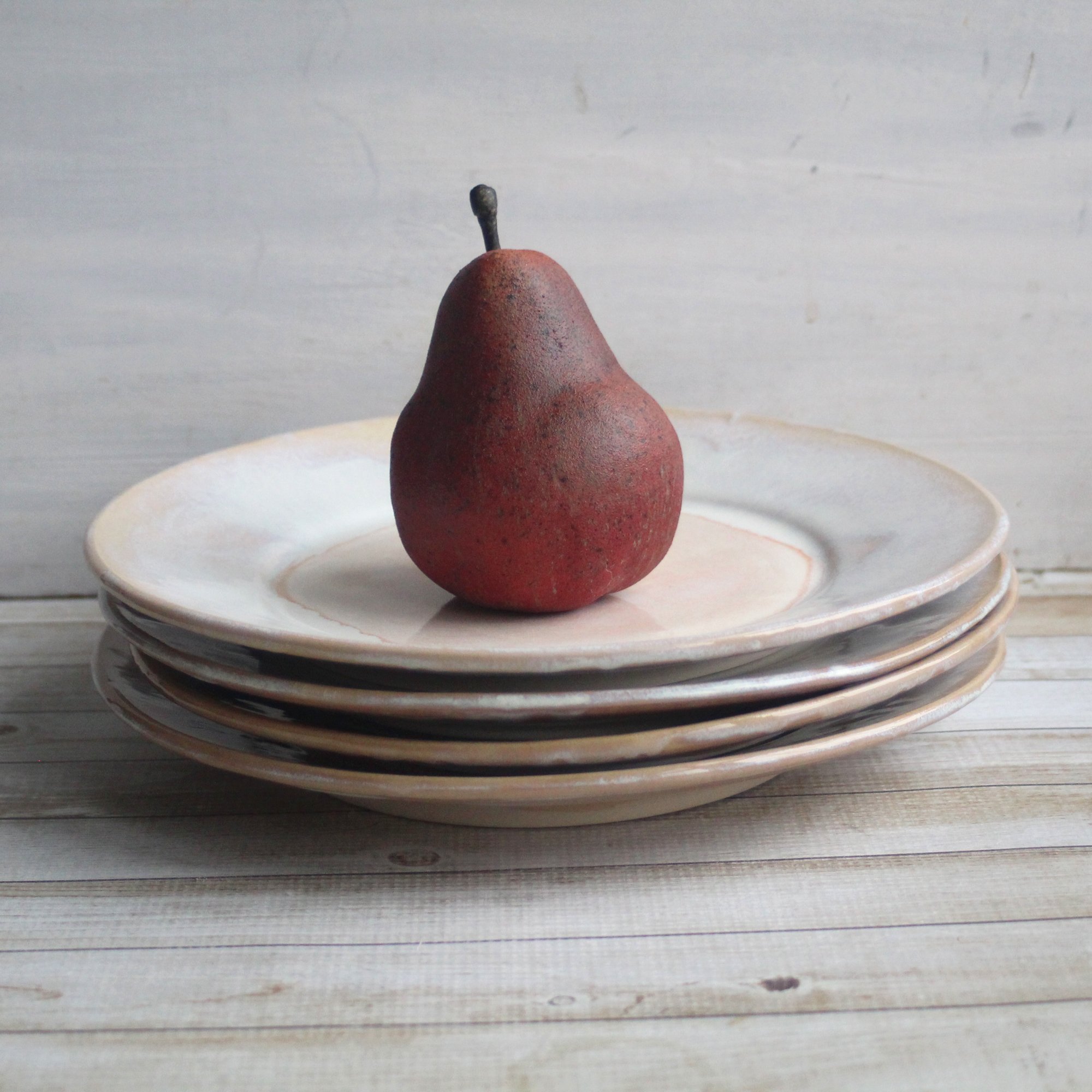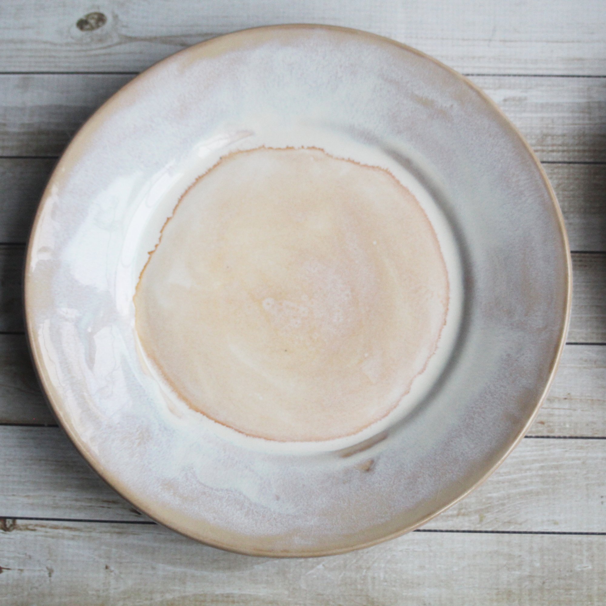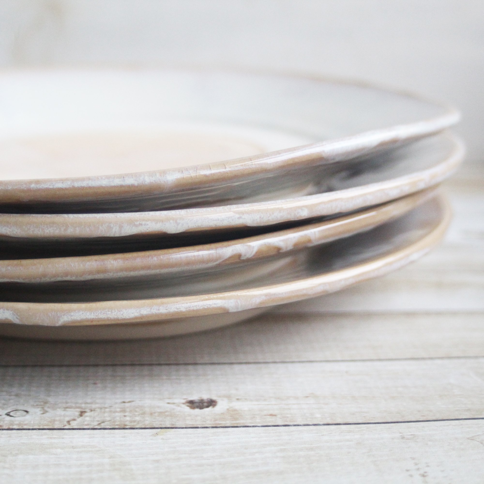 These 4 super rustic dinner plates were hand thrown and trimmed on my potter's wheel using a white stoneware clay. They were bisque fired and glazed with a beautiful white glaze that breaks to ocher and then high fired to cone 6 in my electric kiln. Each plate varies slightly in size and shape as they are each hand crafted. Approximate sizes are 10.5" wide across the top and 1.25" high. Looking for a custom place setting? Please feel free to contact me with questions on designing a set just for you. *These are stock photos, the plates you receive will vary slightly from the pictures due to each being made by hand. *Shipping is $60 USPS Priority mail. If you live in the Northeast, I will refund shipping overages. * READY TO SHIP Dishwasher, microwave, food safe. *Looking for more? please contact me and ask about a custom order. Email Me View more Dinnerware here