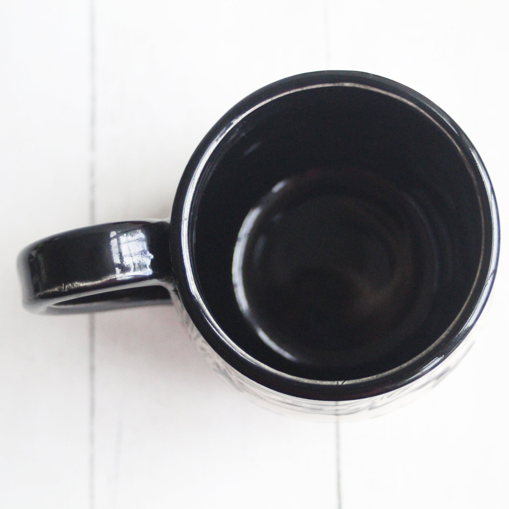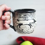 This highly detailed artful mug was hand thrown and trimmed on my pottery wheel using white stoneware clay, it was then covered with black underglaze, then each bear was hand carved, there are 3 different foxes in the design. This method is called sgraffito. It was then bisque fired and glazed and high fired in my electric kiln.