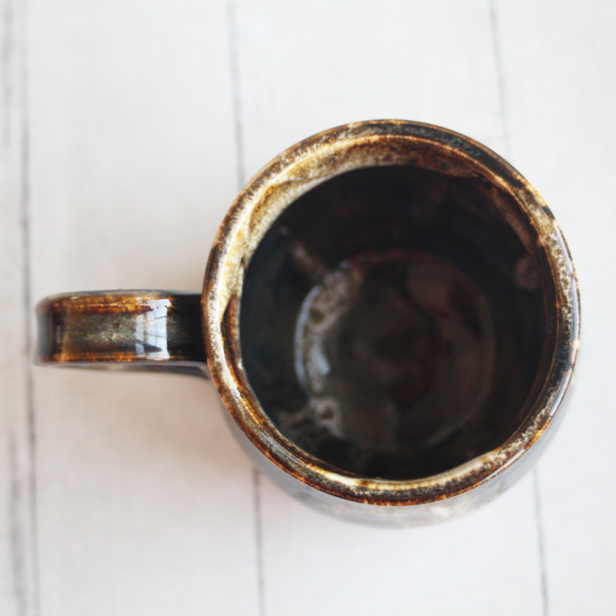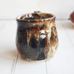This cup was created on my pottery wheel using a white stoneware clay. It was bisque fired and glazed with dripping earthy brown and black glazes. It was then high fired in my electric kiln.