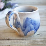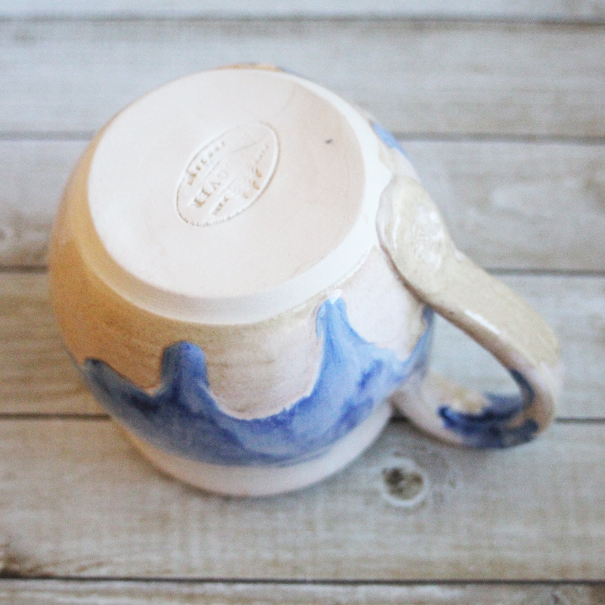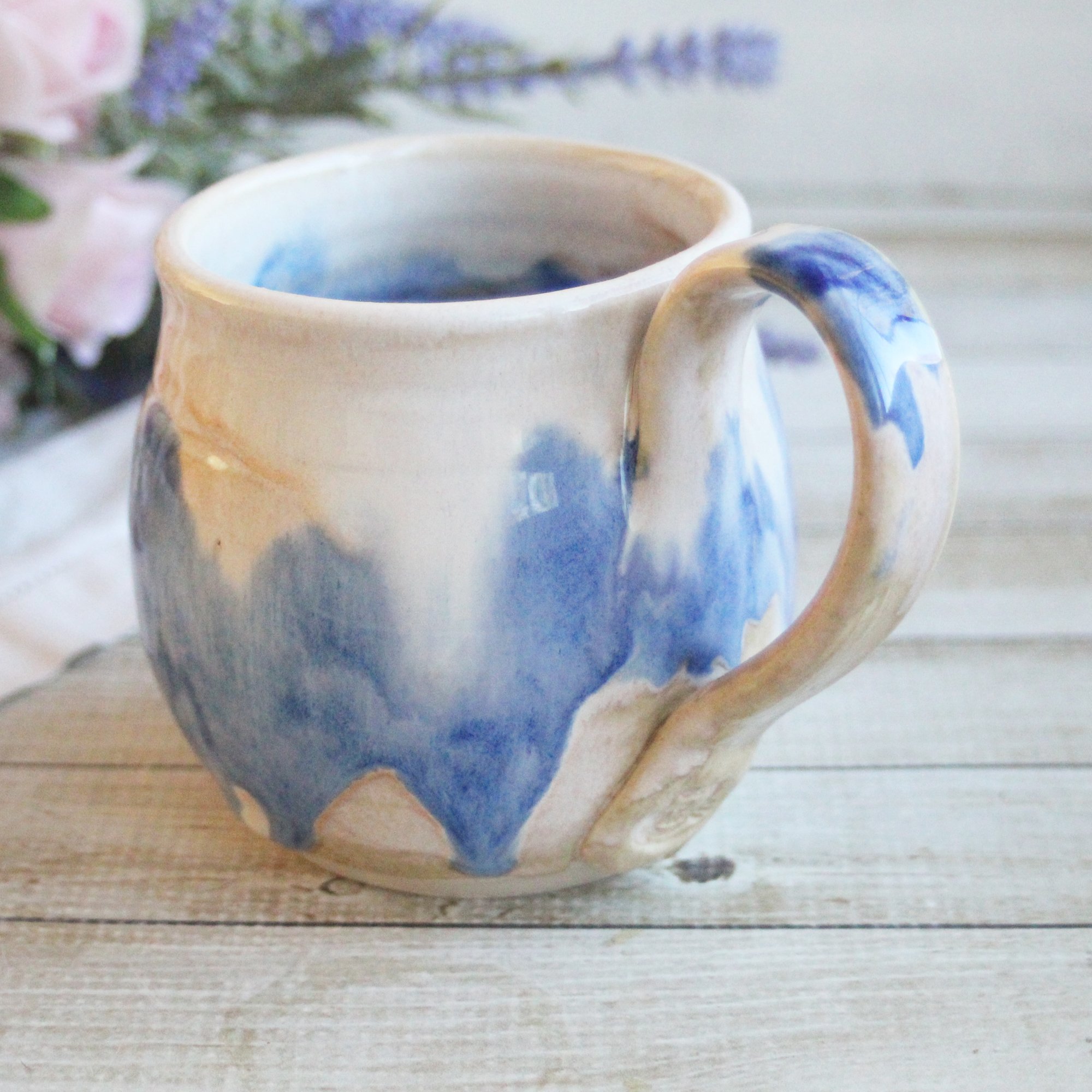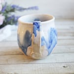 Handmade Pottery Mug with Dripping Blue and White Glazes, 14 Ounce Coffee Cup