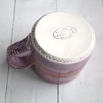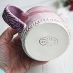 This small mug was hand thrown and trimmed on my pottery wheel using white stoneware clay. It was bisque fired and glazed with a pretty raspberry and lilac glaze, the handle has a leaf pattern impressed on it. It was then high fired in my electric kiln.