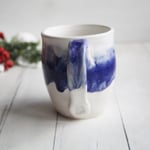 This handmade mug was hand thrown and trimmed on my pottery wheel using white stoneware clay. It was bisque fired and glazed with white and purple glazes. It was then high fired in my electric kiln. Approximate size: 3.5" across the top rim and 4.25" high, holds approximately 14 ounces of liquid. Dishwasher, microwave safe.