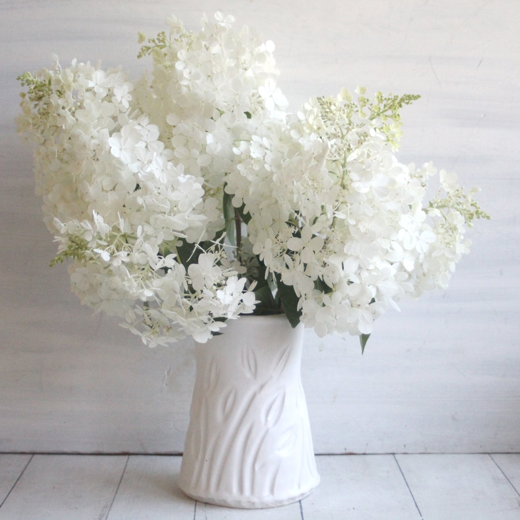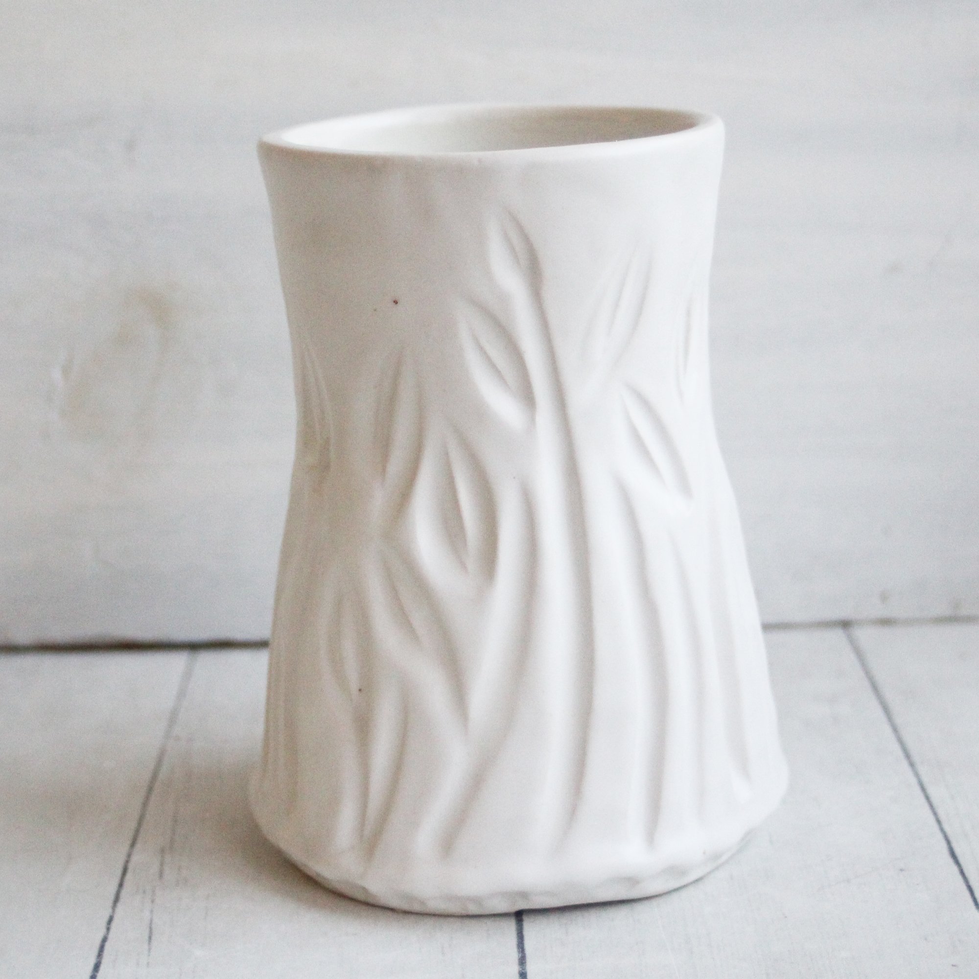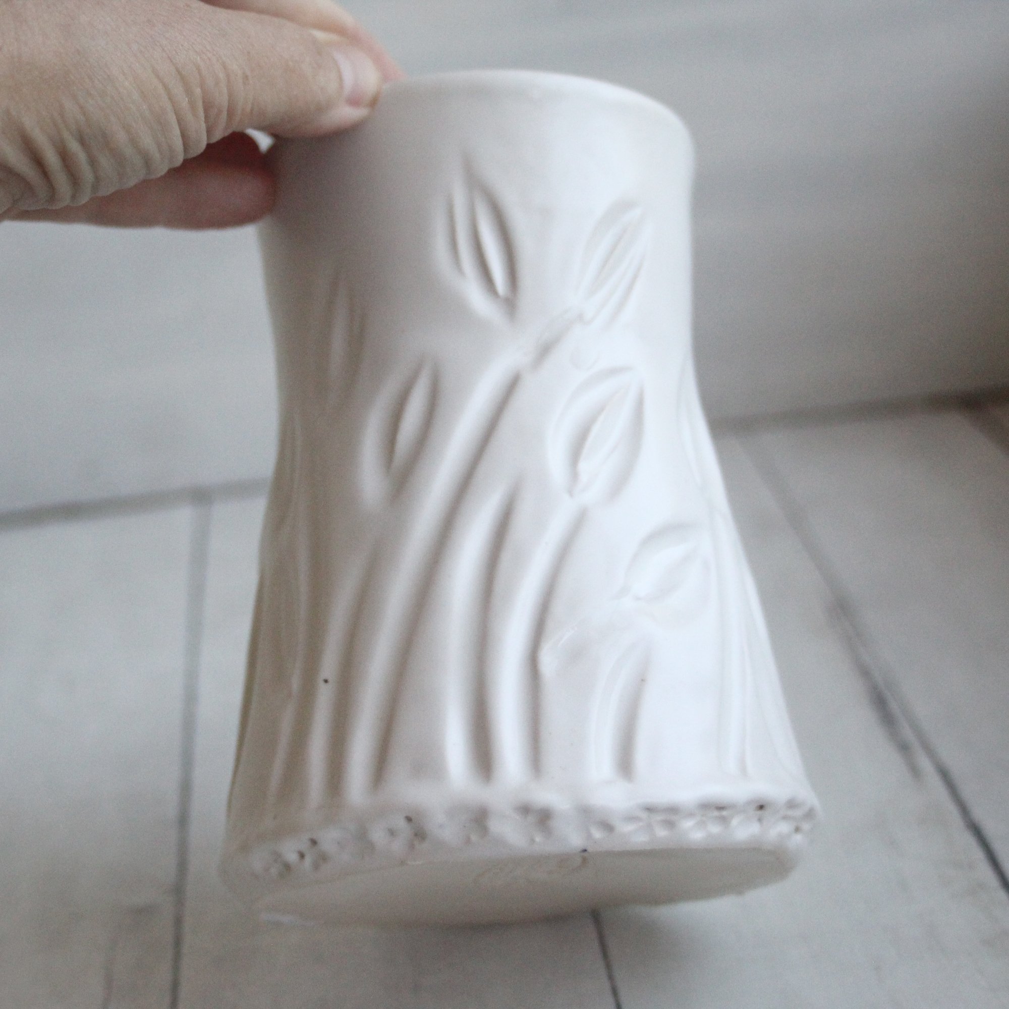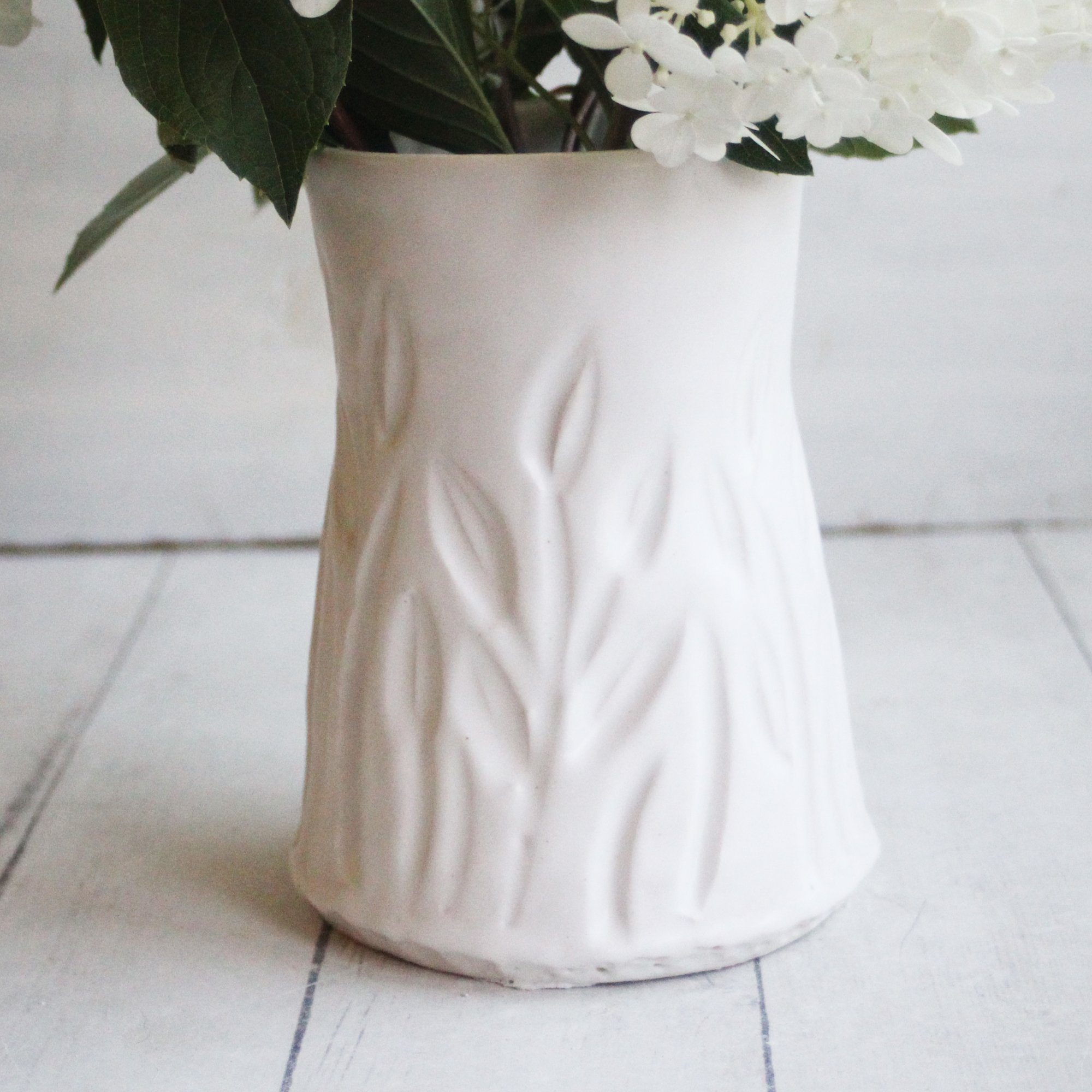 Hand Carved Floral Matte White Vase, Minimalist Decor, Made in USA