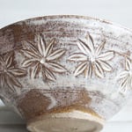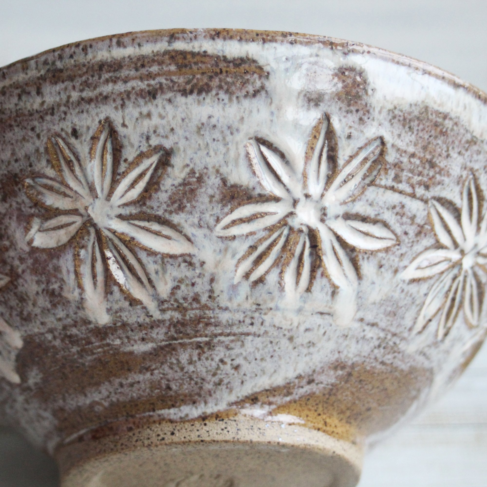 This beautiful rustic bowl was hand thrown and trimmed on my potter's wheel using a speckled brown stoneware clay. Each flower was hand carved around the outer rim to create the daisy design. It was bisque fired and then glazed with a beautiful milky white glaze that allows the speckled brown clay to show through. It was then high fired in my electric kiln.