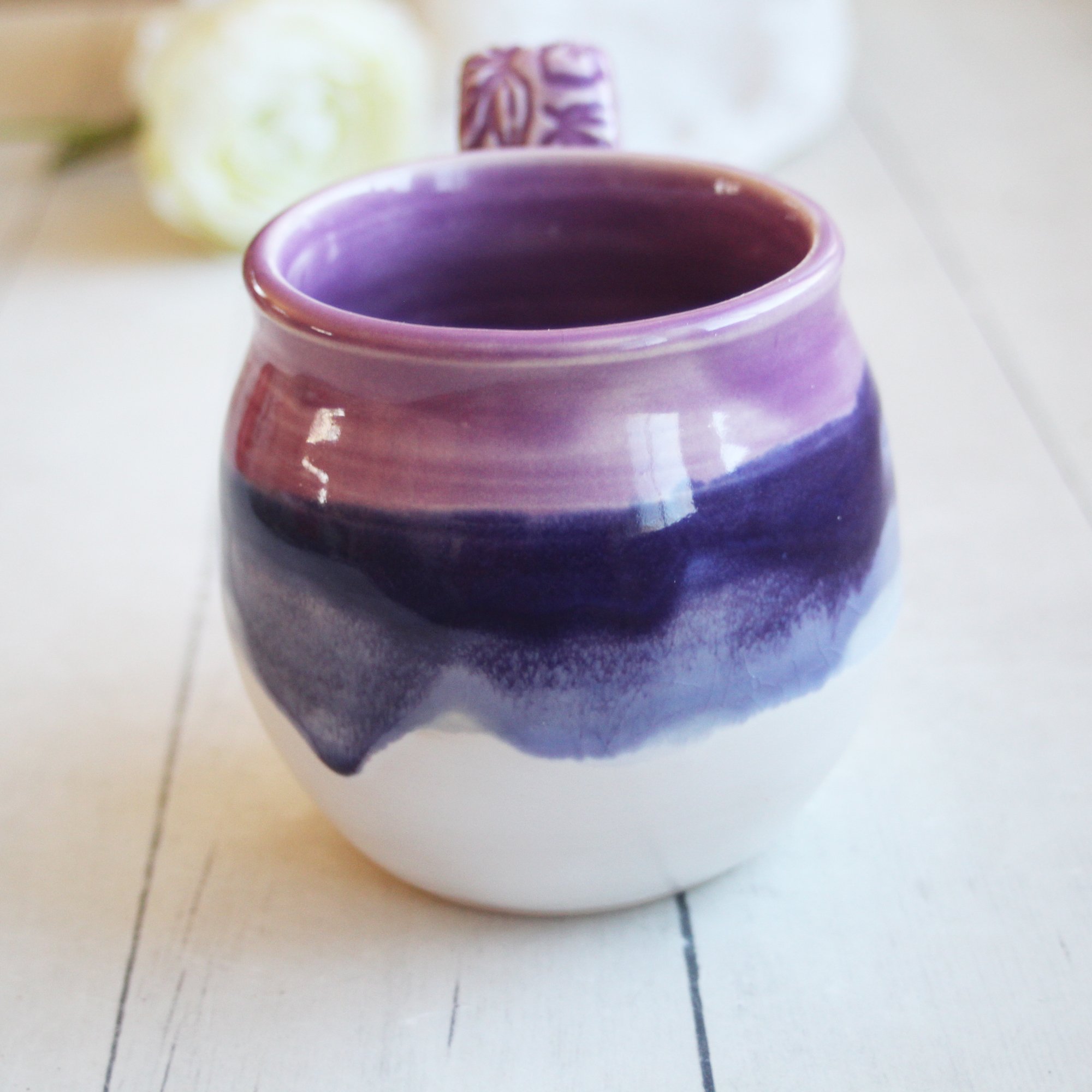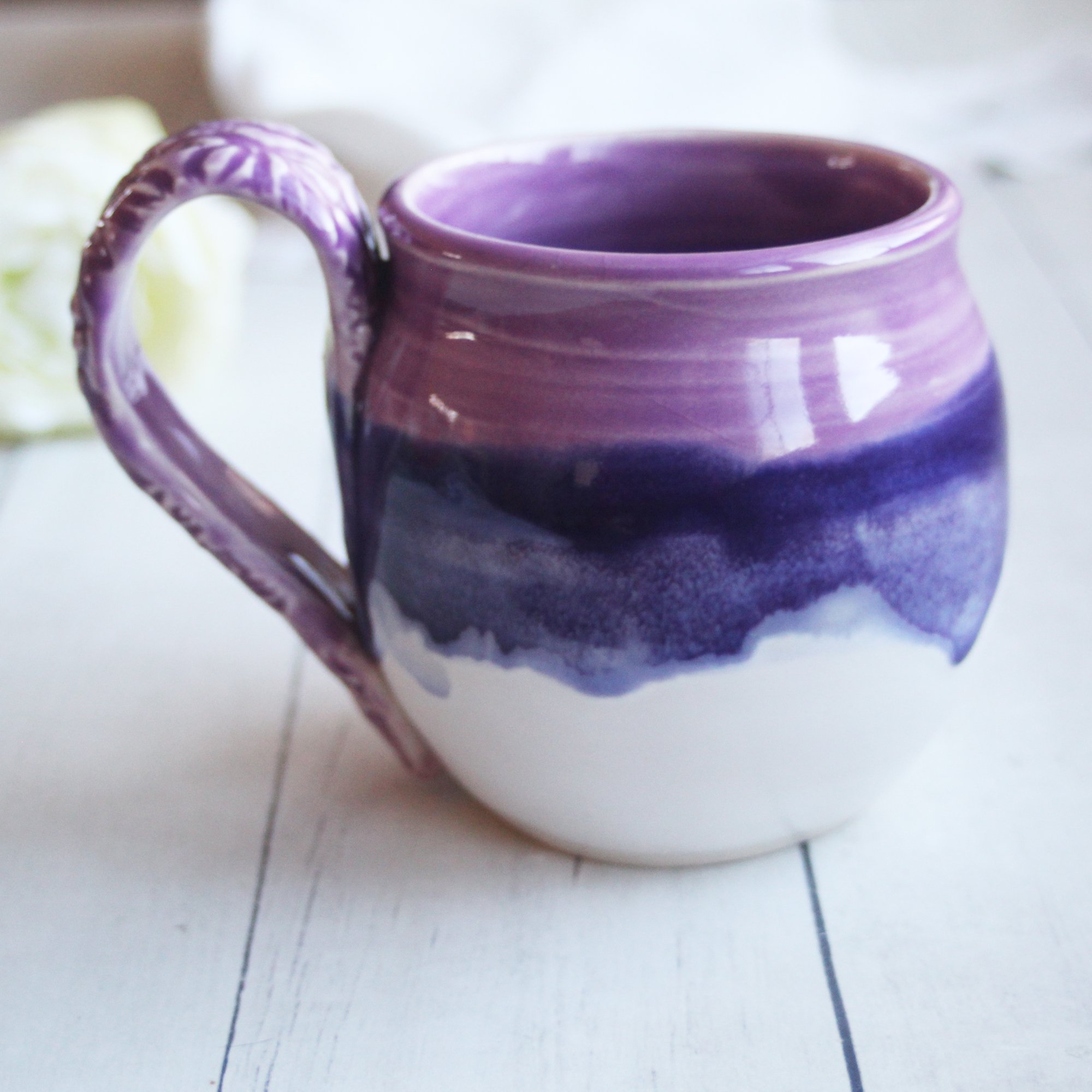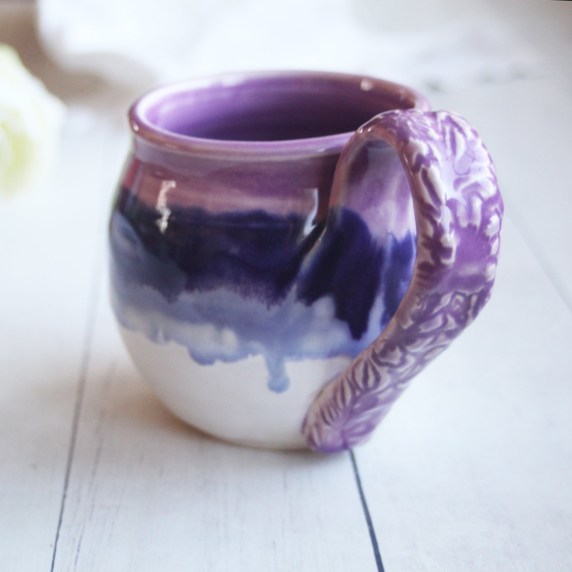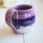 This pretty mug was hand thrown and trimmed on my pottery wheel using white stoneware clay. It was bisque fired and glazed with an a gorgeous shades of pinkish, purples white glazes. It was then high fired in my electric kiln. The handle has a floral imprint on it giving it some added interest. Approximate size: 3.5" across the top rim and 3.75" high, holds approximately 14 ounces of liquid. Dishwasher, microwave safe. *Shipping is $17 for USPS priority mail. *If this is being shipped as a gift, please let me know, and be sure to include a message to the recipient. I am happy to include your message on a beautiful note card. View more mugs and cups look here