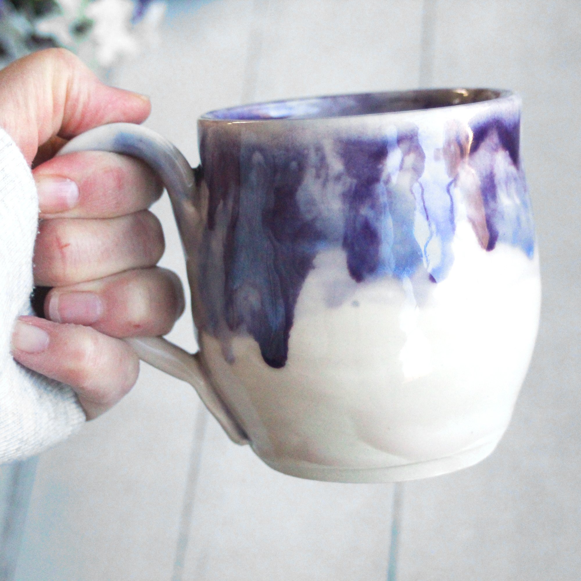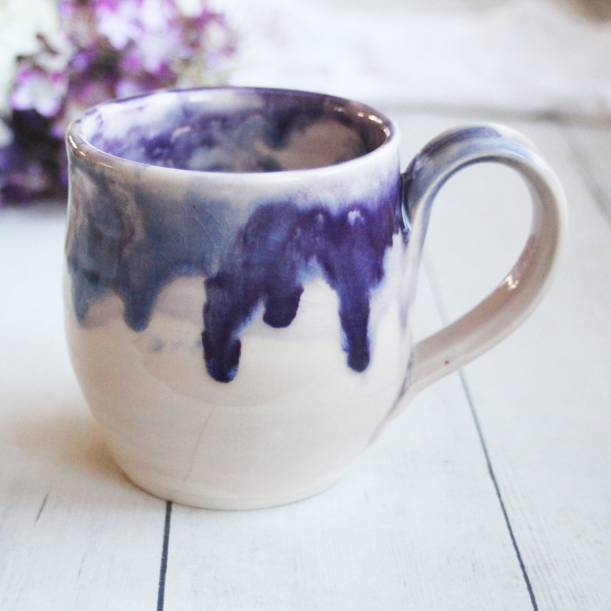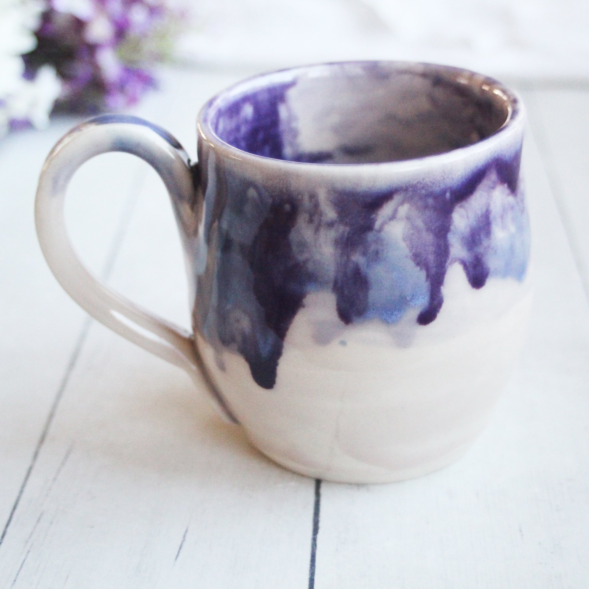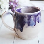 Pottery Mug in White and Purple Dripping Glaze, 13 oz. Coffee Cup, Made in USA