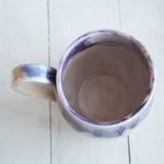 This pretty mug was hand thrown and trimmed on my pottery wheel using white stoneware clay. It was bisque fired and glazed in shades of purple and white glazes. It was then high fired in my electric kiln.