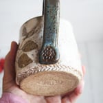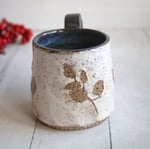 This mug was hand thrown and trimmed on my pottery wheel using a brown stoneware clay. While the clay was still soft I pressed various leaves from my garden into the clay. I then painted the exterior of the mug with white slip (liquid clay). Once the slip was dry, I peeled off the leaves leaving the natural brown clay underneath. It was then bisque fired and glazed with a clear coat on the outside and a blue brown glaze on the inside and fired again in my electric kiln. Because of the botanical removal some slightly rough texture may be felt where the leaves were impressed. Approximate size: 3.5" wide and 3.5" high, holds about 12 ounces of liquid.