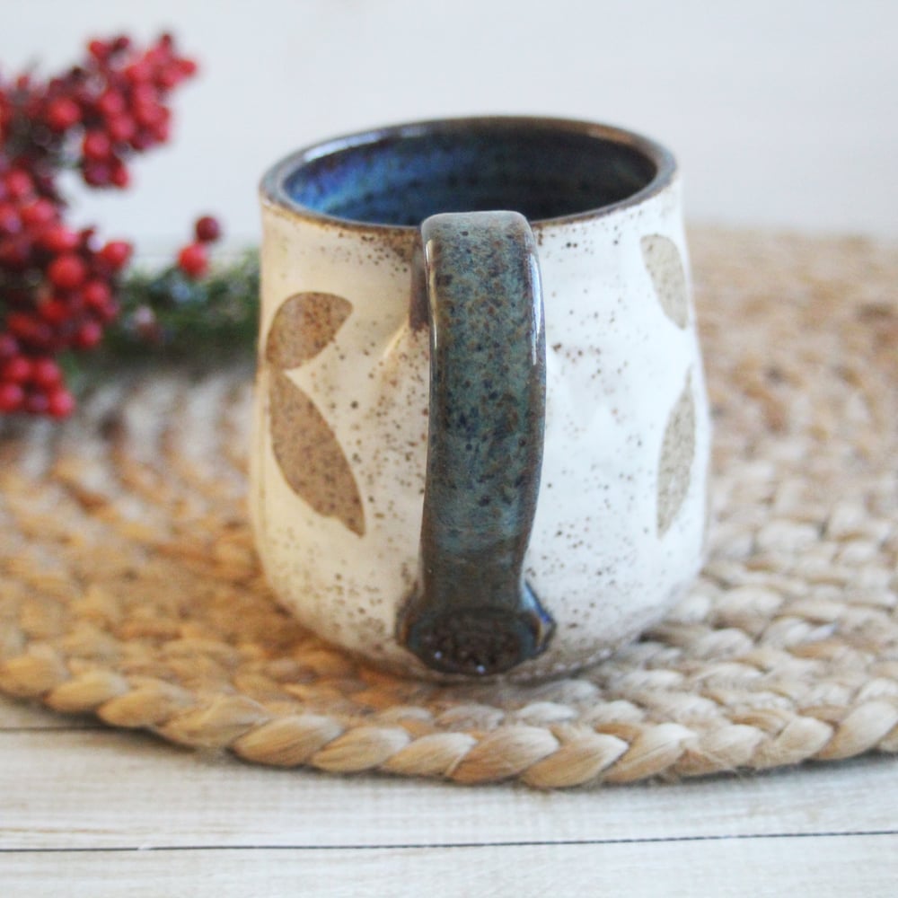 This mug was hand thrown and trimmed on my pottery wheel using a brown stoneware clay. While the clay was still soft I pressed various leaves from my garden into the clay. I then painted the exterior of the mug with white slip (liquid clay). Once the slip was dry, I peeled off the leaves leaving the natural brown clay underneath. It was then bisque fired and glazed with a clear coat on the outside and a blue brown glaze on the inside and fired again in my electric kiln. Because of the botanical removal some slightly rough texture may be felt where the leaves were impressed. Approximate size: 3.5" wide and 4" high, holds about 15 ounces of liquid. *Shipping is $17 for USPS priority mail. *If you are sending this as a gift please let me know by including a message to the recipient in the "note to seller" at check out, I will include a beautiful gift card with your message in the package at no additional cost. View more mugs and cups look here
