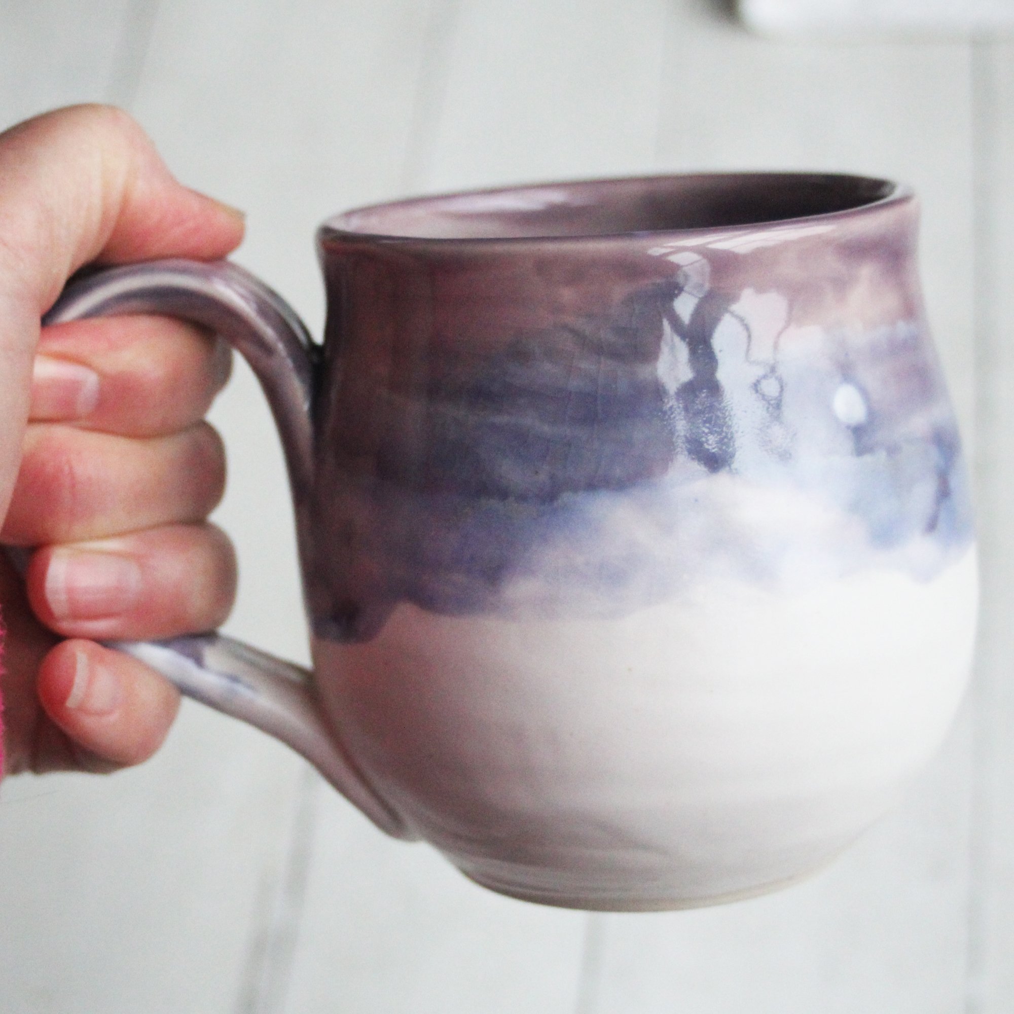 This pretty mug was hand thrown and trimmed on my pottery wheel using white stoneware clay. It was bisque fired and glazed in a purple and white glazes. It was then high fired in my electric kiln.
