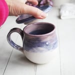 Purple and White Pottery Mug with Warming Lid, Dripping Glazes, 14 Ounce Ceramic Mug, Made in USA