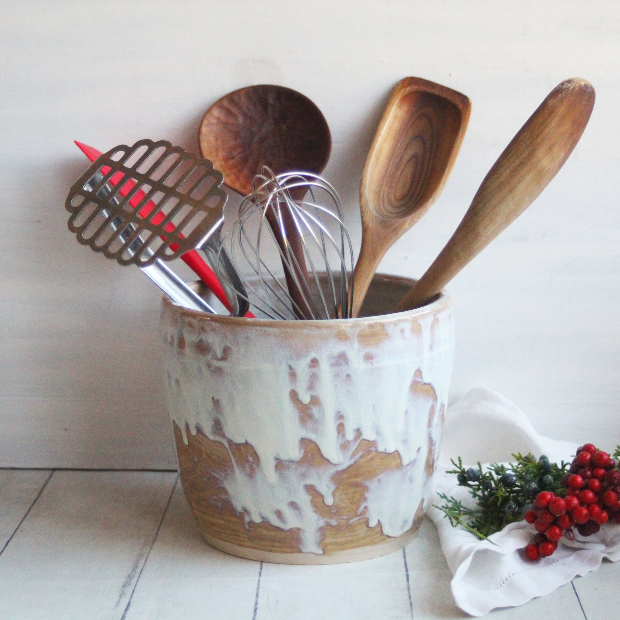 This rustic utensil holder was hand thrown on my pottery wheel using a white stoneware clay. It was bisque fired and glazed with a beautiful rustic white and ocher glaze and high fired in my electric kiln. The roomy size will store a number of different sized kitchen utensils. This is a great piece to have to keep your kitchenware organized. Measures approximately: 7" wide across the top and 5.5" high.