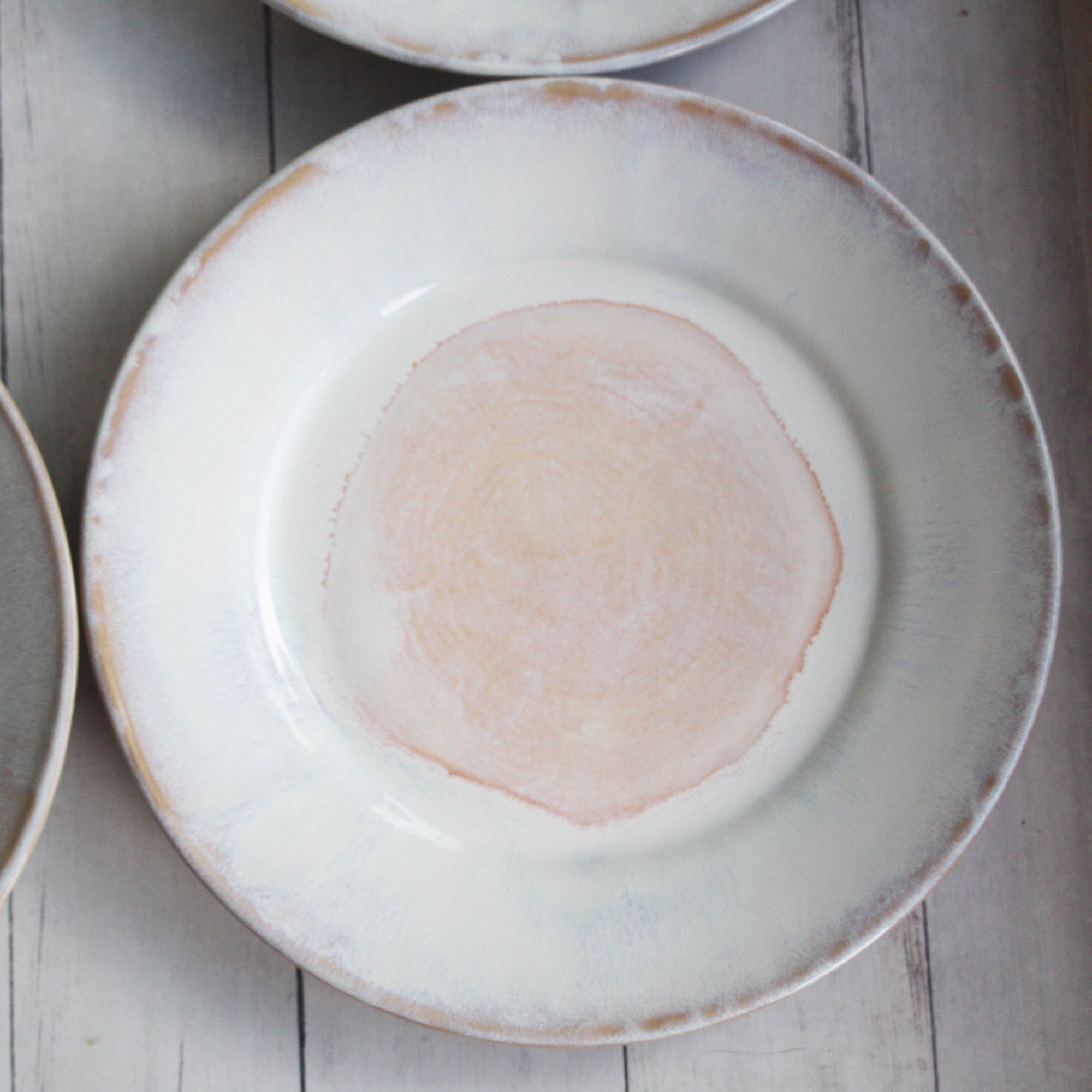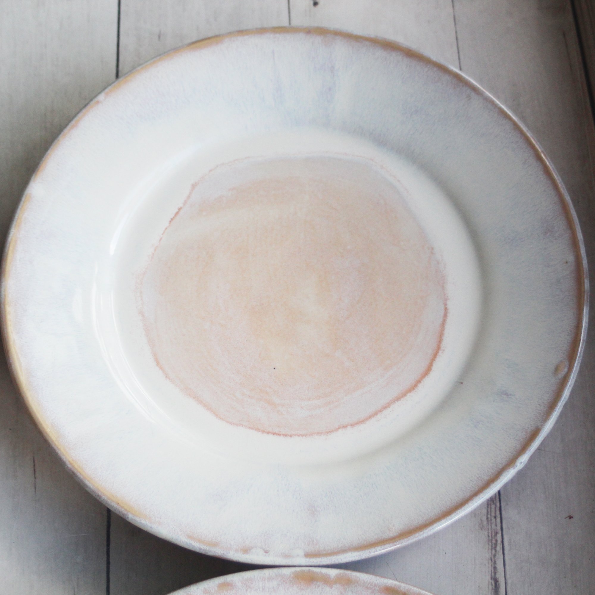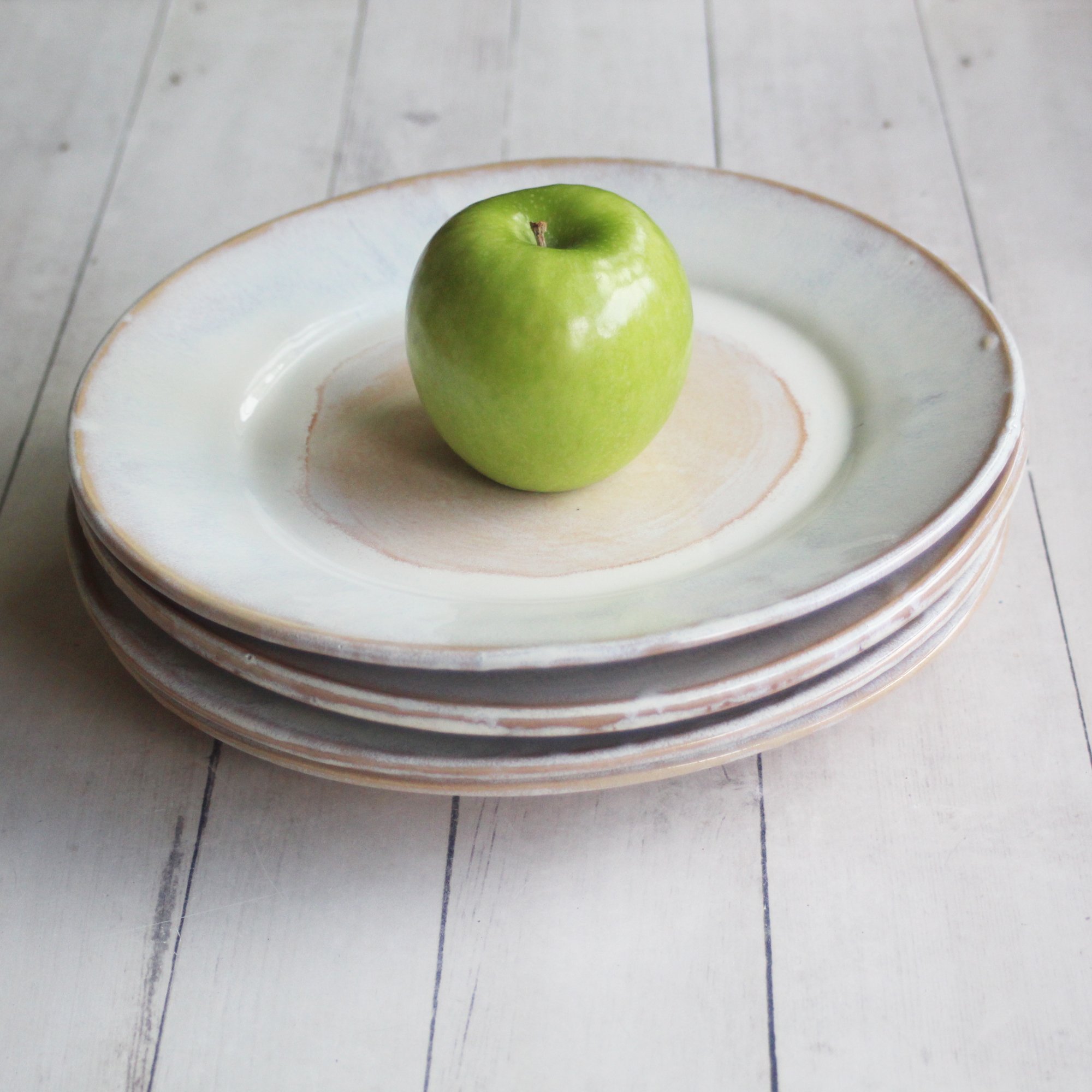 These 4 super rustic dinner plates were hand thrown and trimmed on my potter's wheel using a white stoneware clay. They were bisque fired and glazed with a beautiful white glaze that breaks to ocher and then high fired to cone 6 in my electric kiln.