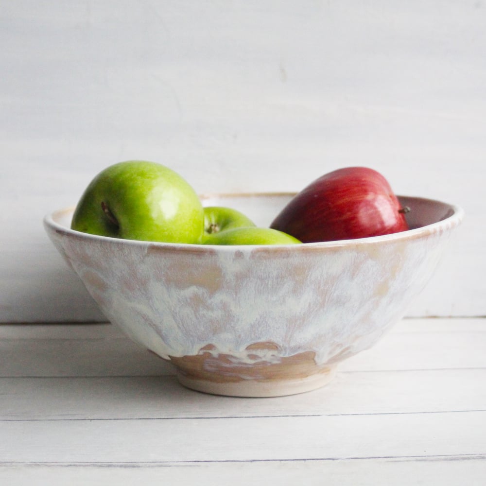 This gorgeous bowl was hand thrown and trimmed on my pottery wheel using a white stoneware clay. It was bisque fired and glazed with beautifully rustic white and ocher glazes and high fired in my electric kiln.