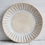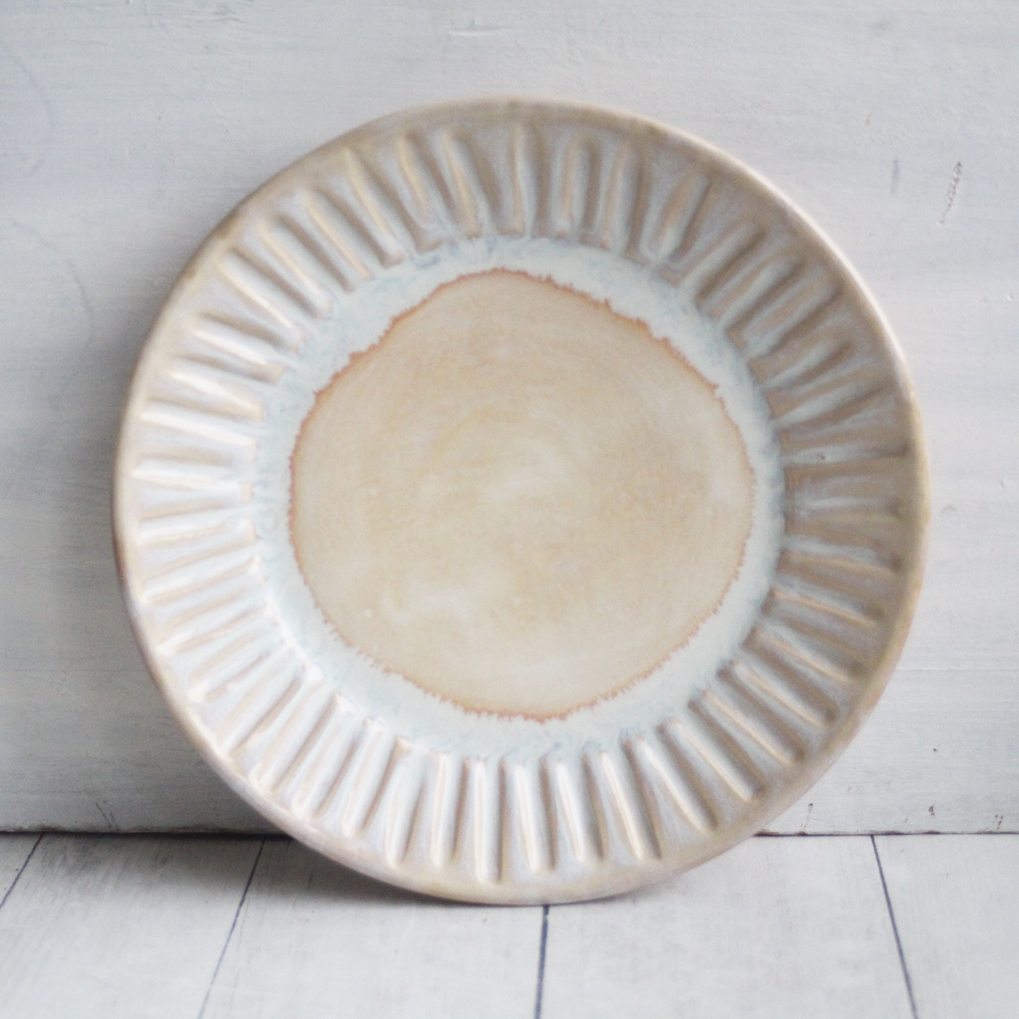 This set of four side plates were hand thrown and trimmed on my pottery wheel using a white stoneware clay. Each plate was hand carved to create the rustic groved design. They were bisque fired and glazed with a rustic creamy white and light ocher glaze and high fired in my kiln.