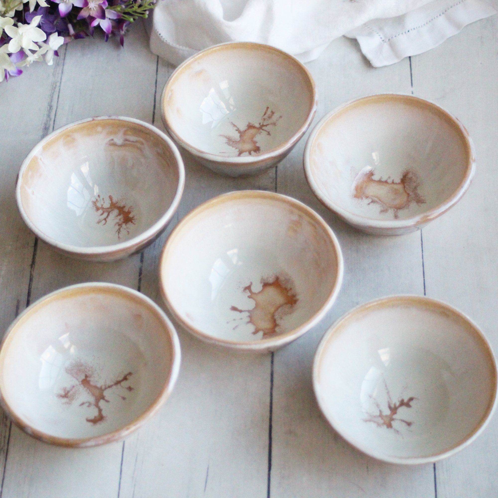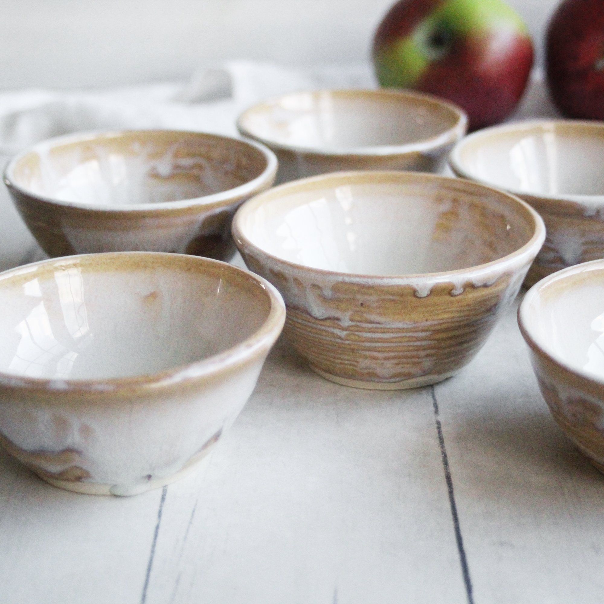 This listing is for a set of three prep bowls. These little bowls were hand thrown and trimmed on my potter's wheel. They were then bisque fired and painted with a gorgeous dripping white glaze over a toasted ocher. They were then fired to cone 6 in my electric kiln. The inside is smooth and the outside glaze has a slight textured feel.
