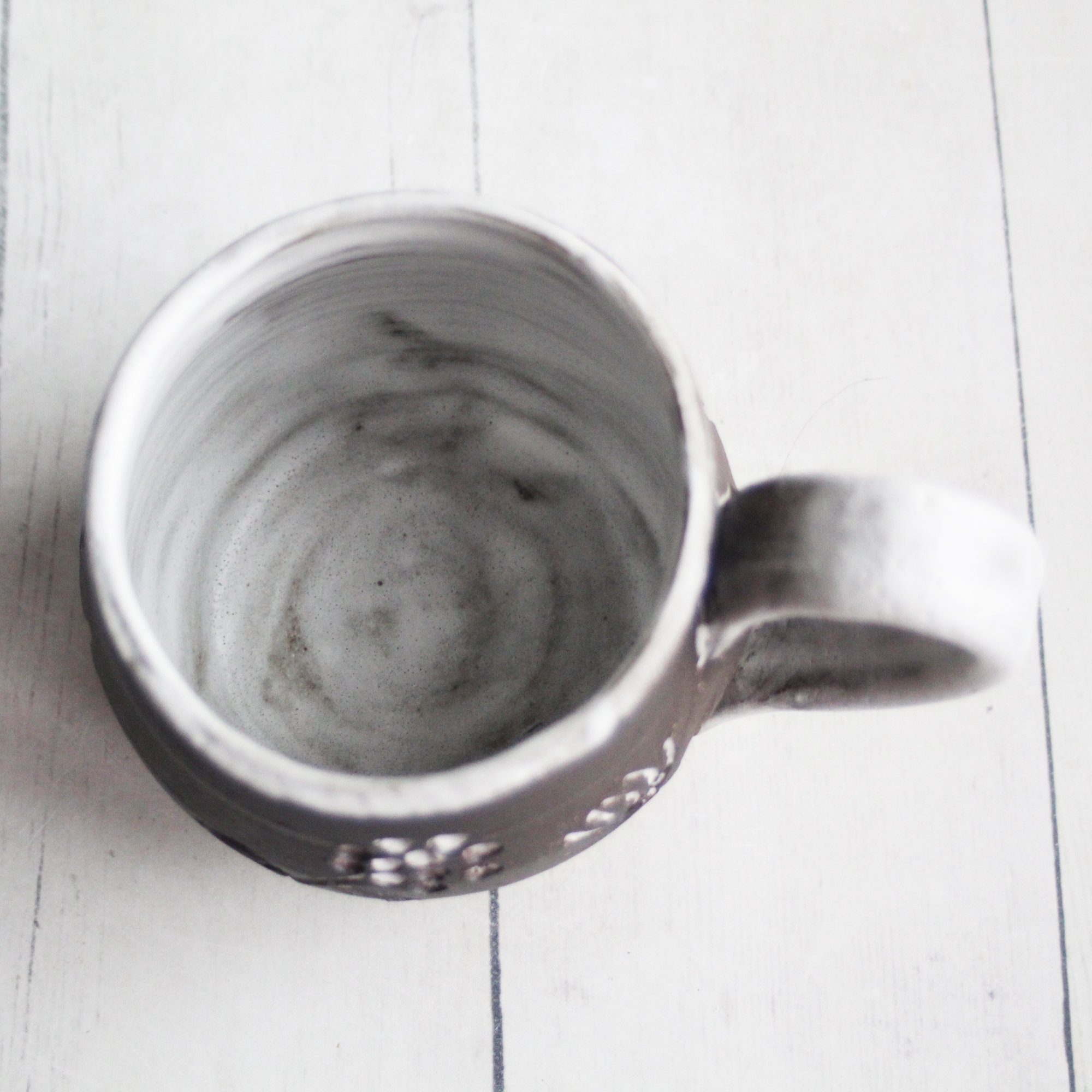 This rustic mug was hand thrown and trimmed on my pottery wheel using a very dark brown stoneware clay. It was bisque fired and glazed with matte white glaze on the inside, the clay on the exterior was left raw and unglazed except for the carved areas making an interesting contrast. It was then high fired in my electric kiln.