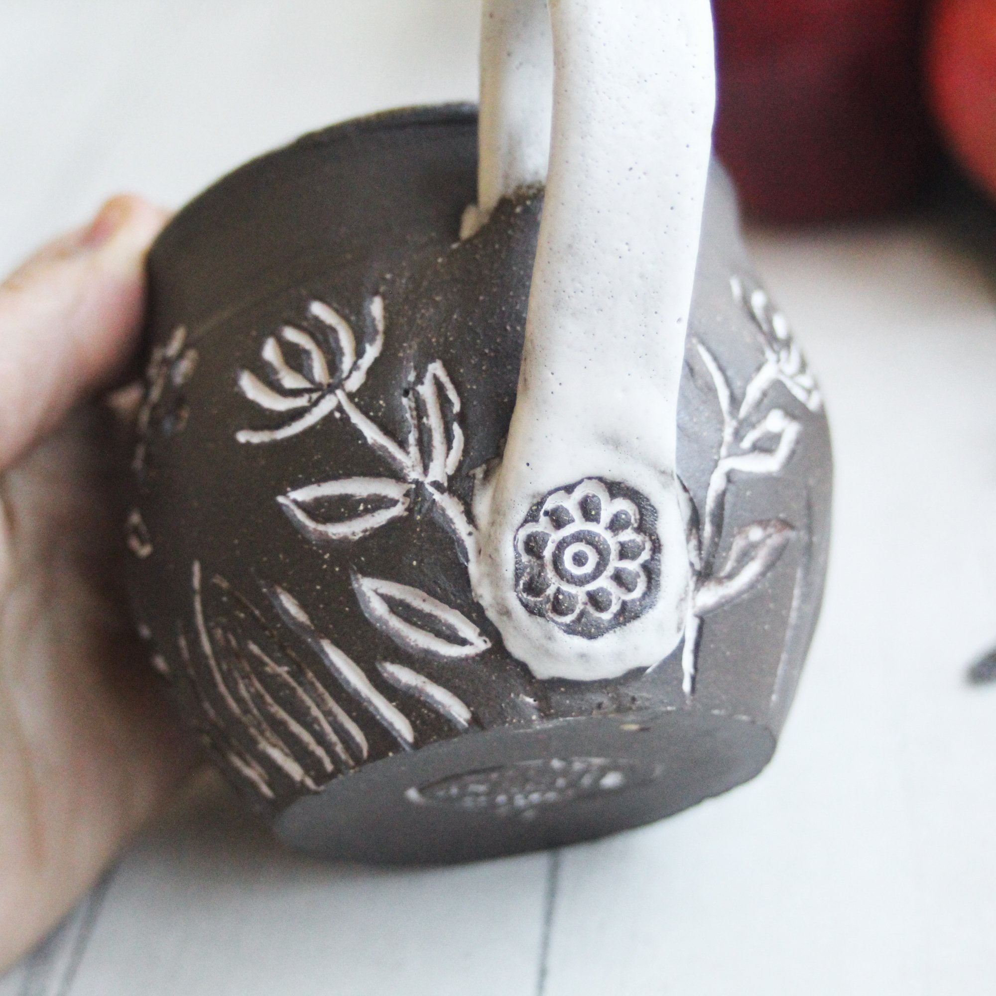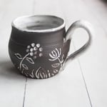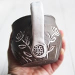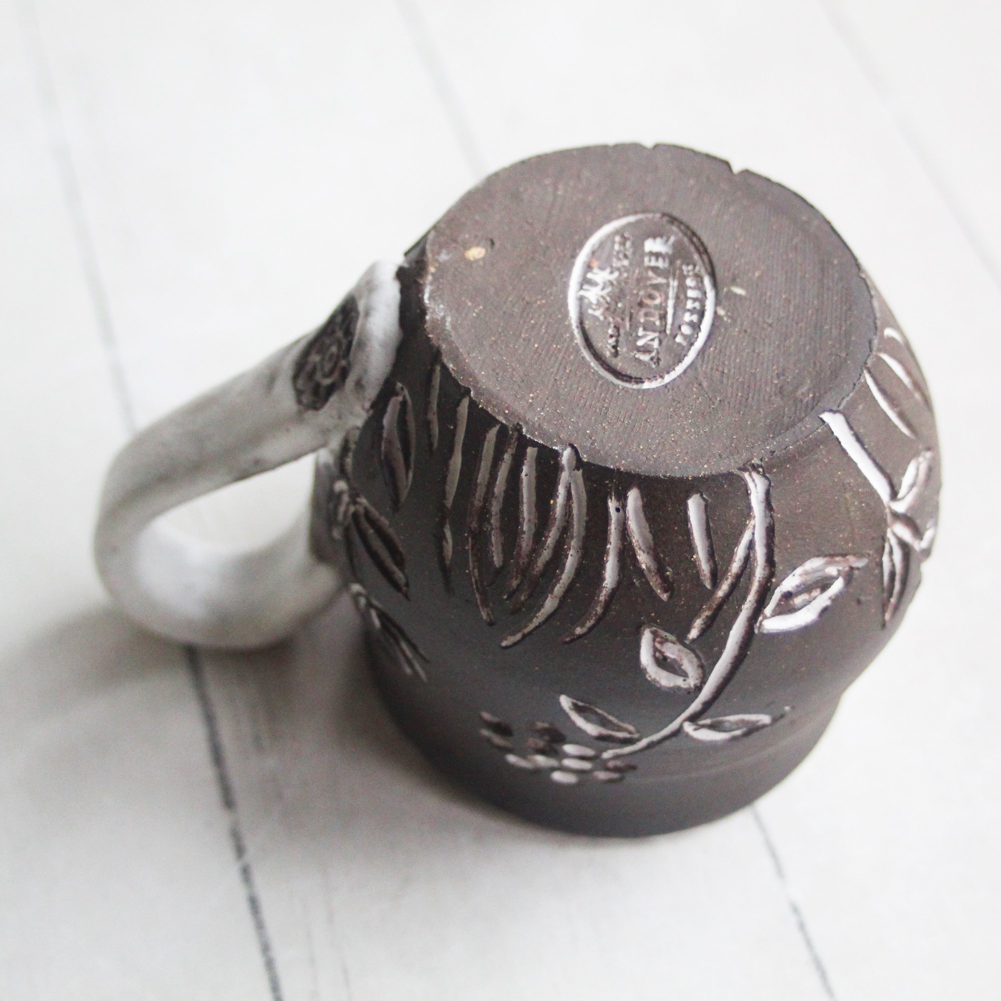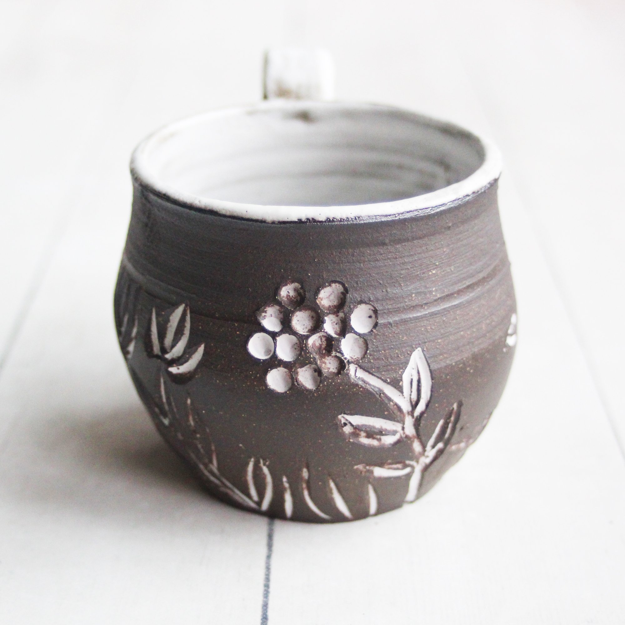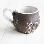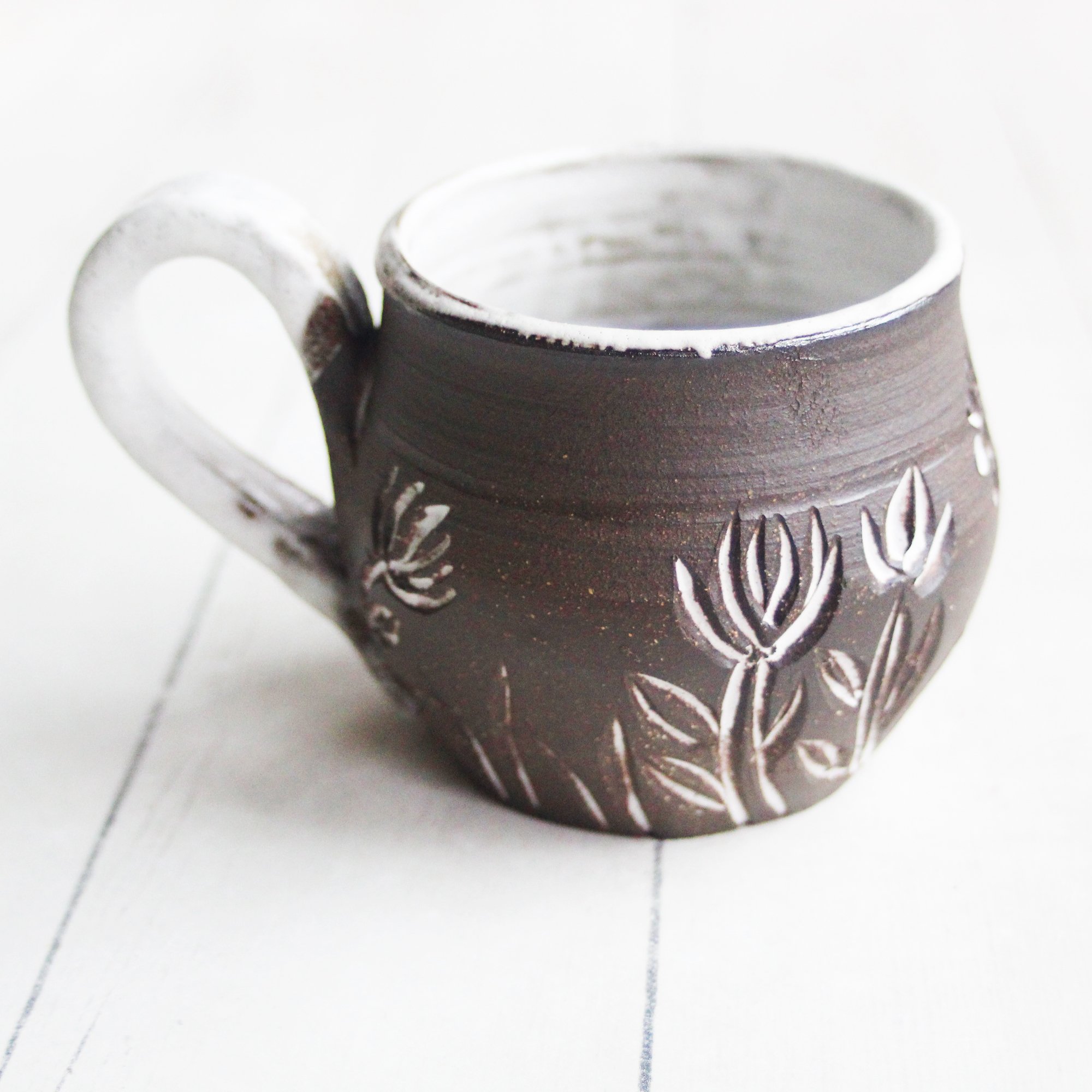 Small Pottery Mug with Dark Brown Raw Stone Clay, Carved Flowers, Made in USA