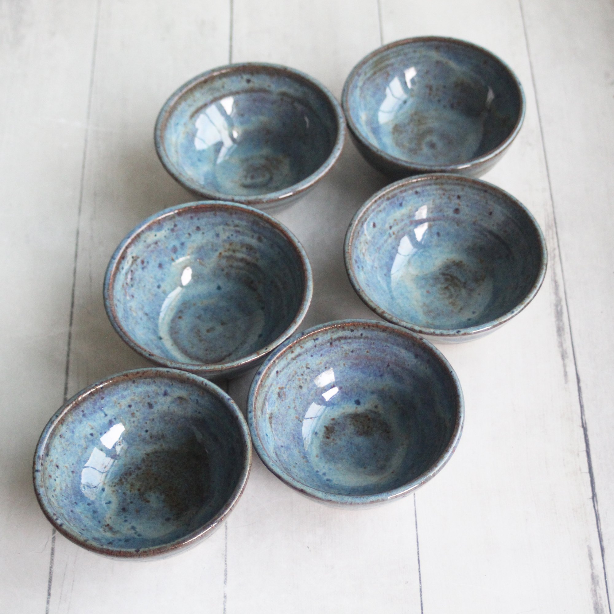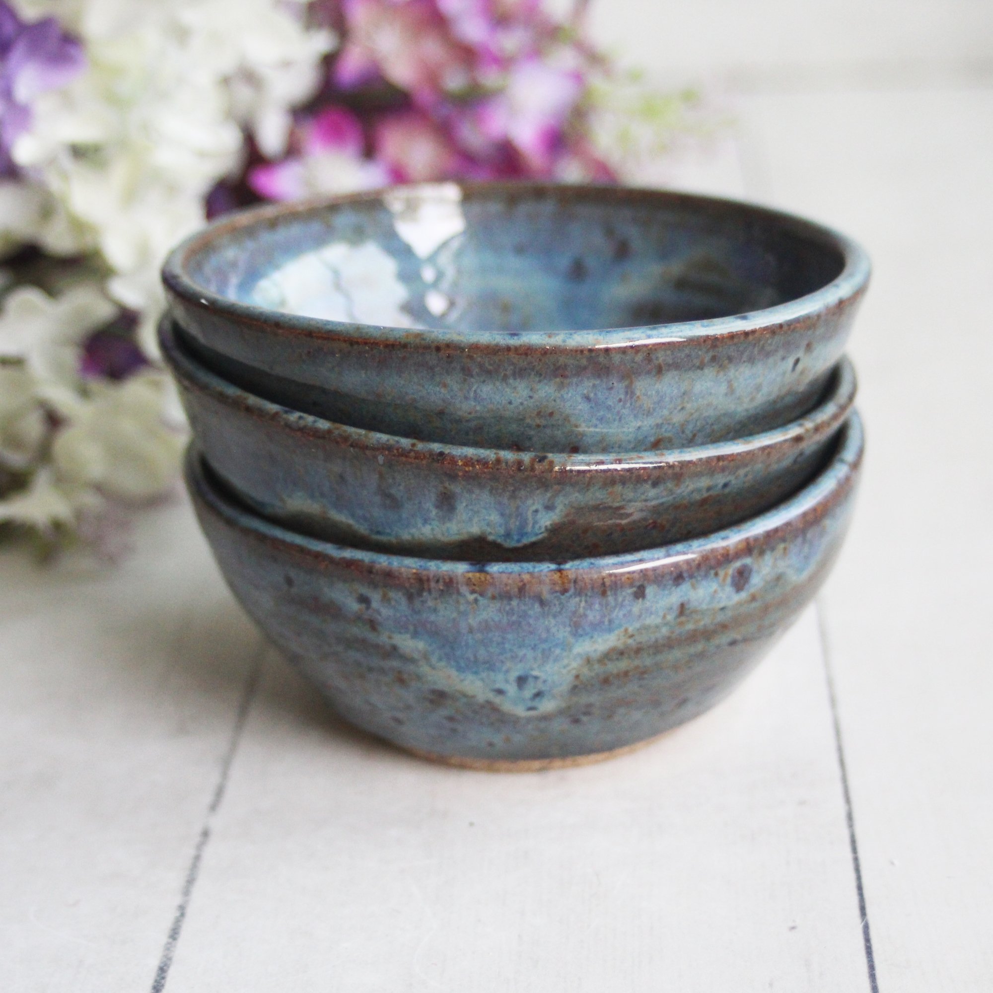 This listing is for three of these prep bowls. All were hand thrown and trimmed on my potter's wheel using a speckled brown stoneware clay. They were then bisque fired and covered with a beautiful deep blue glaze. They were then fired to cone 6 in my electric kiln.