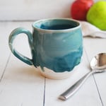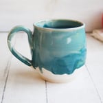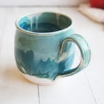 Turquoise and White Mug with Dripping Glazes, 16 Ounce Handcrafted Coffee Cup, Made in USA