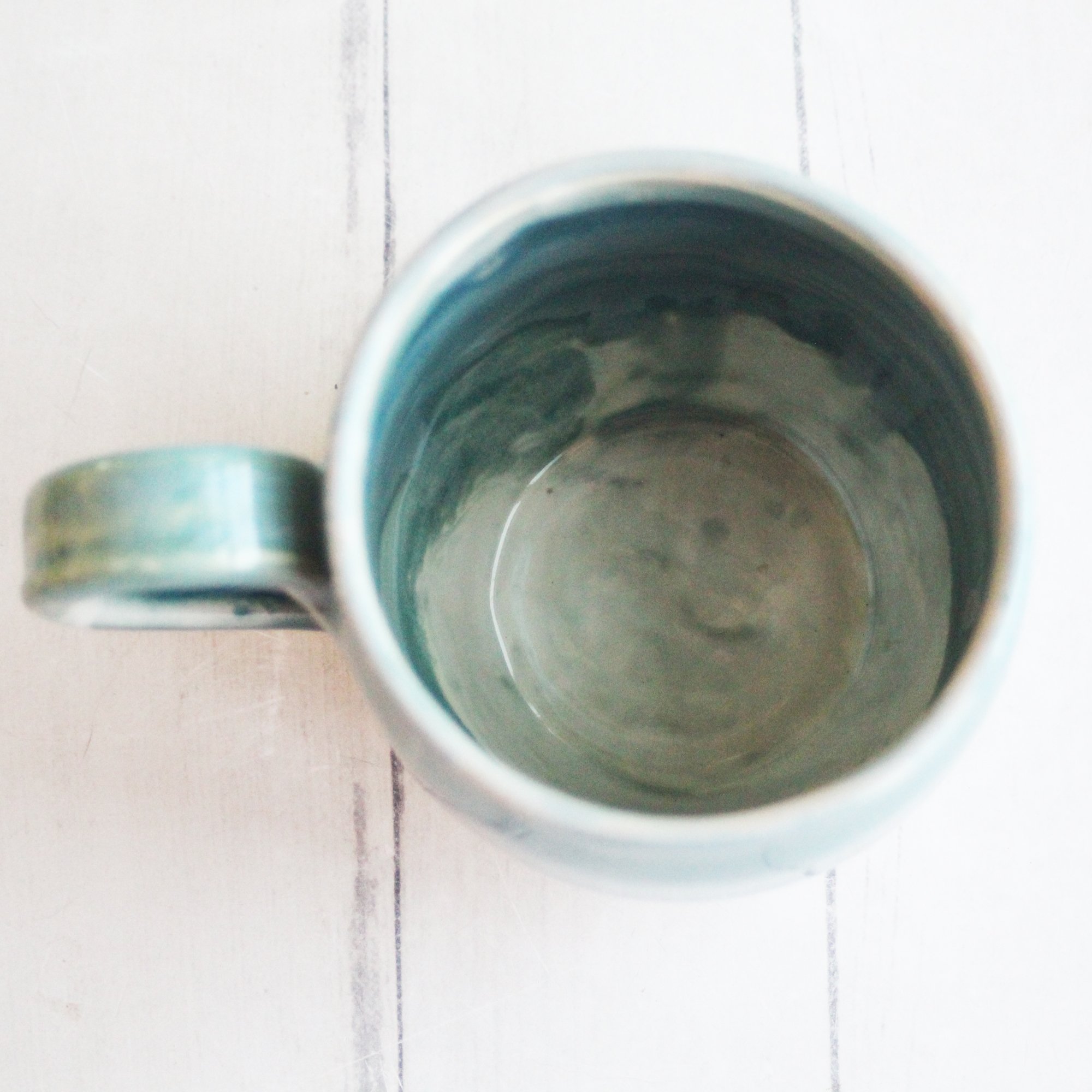 This mug was hand thrown and trimmed on my pottery wheel using white stoneware clay. It was bisque fired and glazed using beautiful dripping white and turquoise glazes. It was then high fired in my electric kiln.